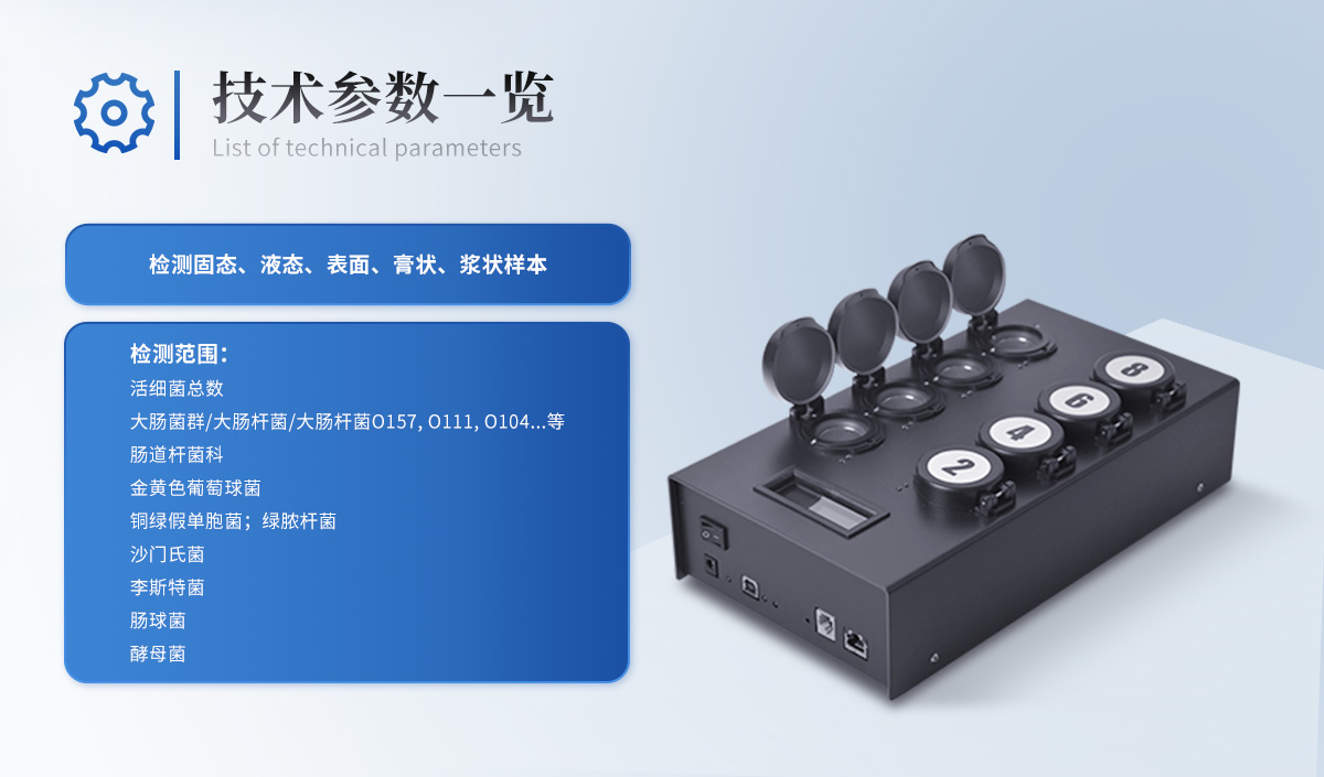 | 可分析介質(zhì): 食品、水、固體、液體、物體表面 | 可分析微生物項目: 腸球菌屬、大腸桿菌群、金黃色葡萄球菌、大腸埃希菌、沙門氏菌屬、腸桿菌科、李斯特菌屬、綠膿桿菌、酵母菌;總活菌數(shù); | 設(shè)備優(yōu)點: 速度快 、使用簡單、敏感性強、適用性廣、費用低 | MBS微生物快速檢測系統(tǒng),意大利原裝進口。基于意大利羅馬大學(xué)的國際尖端MBS 法專利檢測技術(shù),集快速培養(yǎng)和高靈敏度創(chuàng)新檢測方法于一體,大大縮短檢測時間;使復(fù)雜的微生物檢測變得簡單易行, 操作簡便,無需任何前處理, 全密閉檢測系統(tǒng)安全無害, 廣泛適用于食藥系統(tǒng)、食品企業(yè)、日化產(chǎn)品制造業(yè)、醫(yī)療衛(wèi)生、醫(yī)藥研究制造業(yè)、環(huán)保以及餐飲服務(wù)企業(yè)。 |