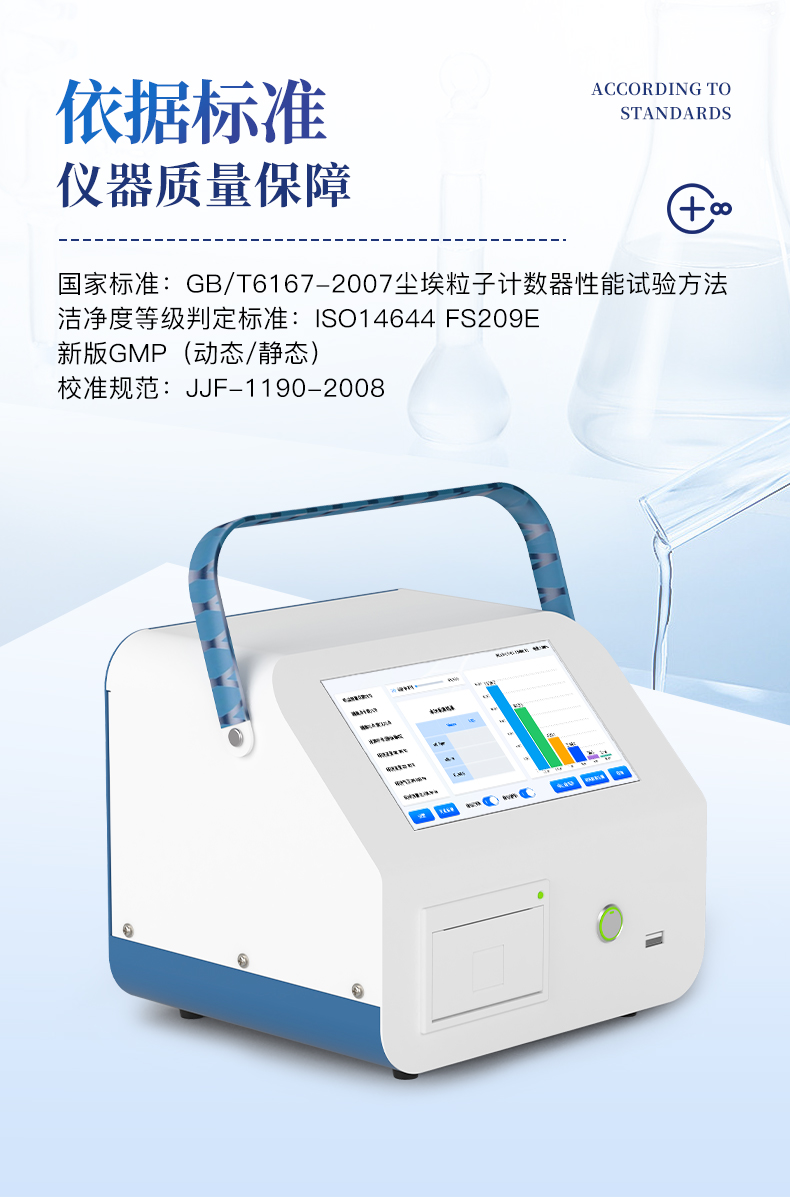 國家標準:GB/T6167-2007塵埃粒子計數器性能試驗方法 潔凈度等級判定標準:ISO14644 FS209E ,新版GMP(動態/靜態) 校準規范:JJF-1190-2008