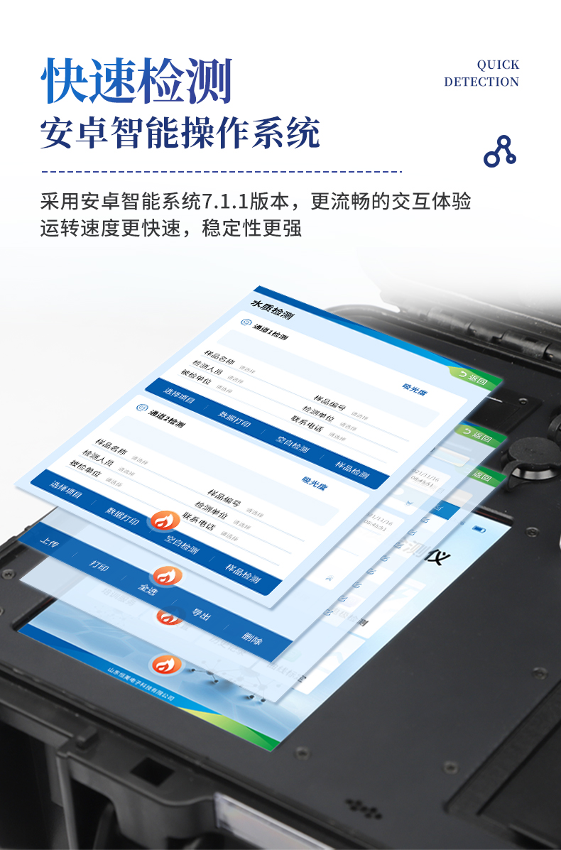 YT-BC型便攜式COD檢測(cè)儀采用高強(qiáng)度PVC工程塑料手提箱設(shè)計(jì),消解檢測(cè)一體式設(shè)計(jì),其中消解模塊具備雙溫區(qū)功能,檢測(cè)部分同時(shí)具備360°旋轉(zhuǎn)比色試管檢測(cè)和比色皿檢測(cè),安卓智能操作系統(tǒng),8英寸高清液晶觸摸屏,光纖檢測(cè)技術(shù),進(jìn)口光源,內(nèi)置大容量鋰電池,便攜多參數(shù)水質(zhì)檢測(cè)儀具有性能穩(wěn)定、測(cè)量準(zhǔn)確、測(cè)定范圍廣、功能強(qiáng)大、操作簡(jiǎn)單等特點(diǎn)。
