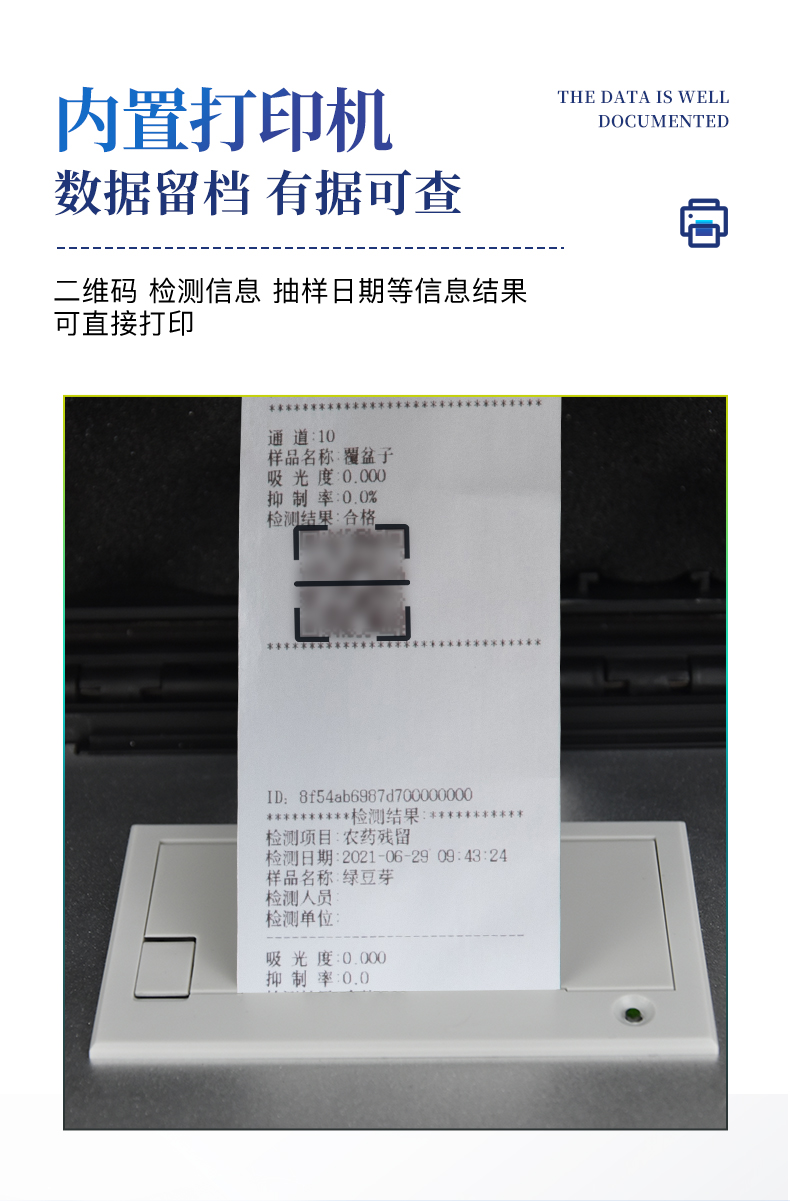 顯示方式:≥5英寸液晶觸摸屏顯示,人性化中文操作界面,讀數直觀、簡單。配備嵌入式高速熱敏打印機,可選擇手動打印或者自動打印,三分鐘出打印結果。光源采用進口超高亮發光二極管,具有低功耗、穩定性強、高靈敏度,高檢測精度,高重復性精度,光源可控、響應速度快等優點。采用標準USB接口設計,免驅動安裝,方便數據的存貯和移動,并可隨時與計算機直接相連,并且可用計算機控制儀器。實現數據查詢、瀏覽、分析、統計、打印等。智能化程度高,儀器具有自檢功能:具有開機自檢和調零功能,具有自動檢測重復性功能內置強大的數據庫,可在儀器上直接選擇樣品名稱、檢測指標、送檢單位等信息,也可在儀器上直接編輯錄入樣品名稱、檢測指標、送檢單位等信息并保存進樣品數據庫。支持Wifi網絡,數據可局域網和互聯網數據上傳,檢測結果直接傳至食品安全監管平臺。進行區域食品安全監管及大數據分析處理,檢測區域食品安全長短期動態,達到食品安全問題預估、預警