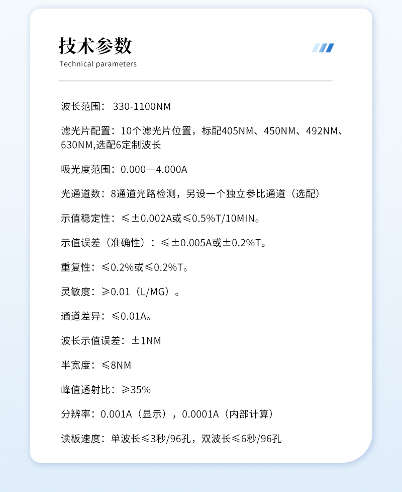 *讀板速度:單波長≤3秒/96孔,雙波長≤6秒/96孔