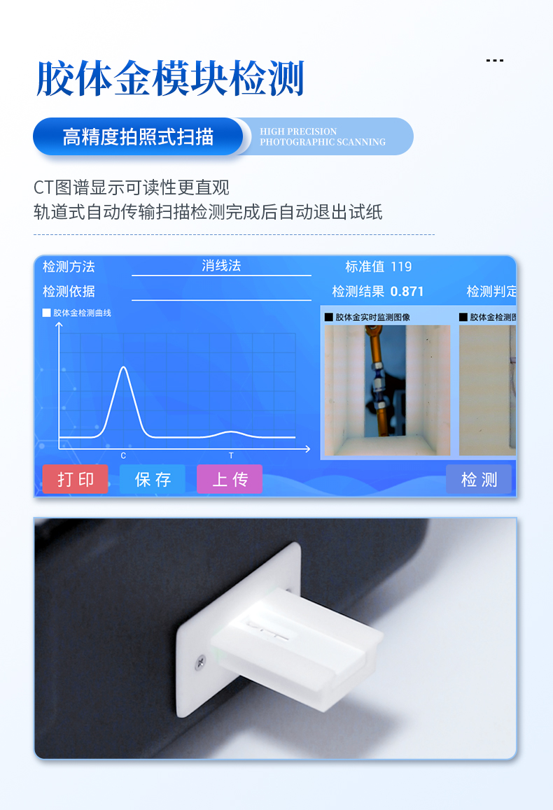 膠體金模塊檢測方式:軌道式自動傳輸掃描,檢測完成后自動退出試紙。