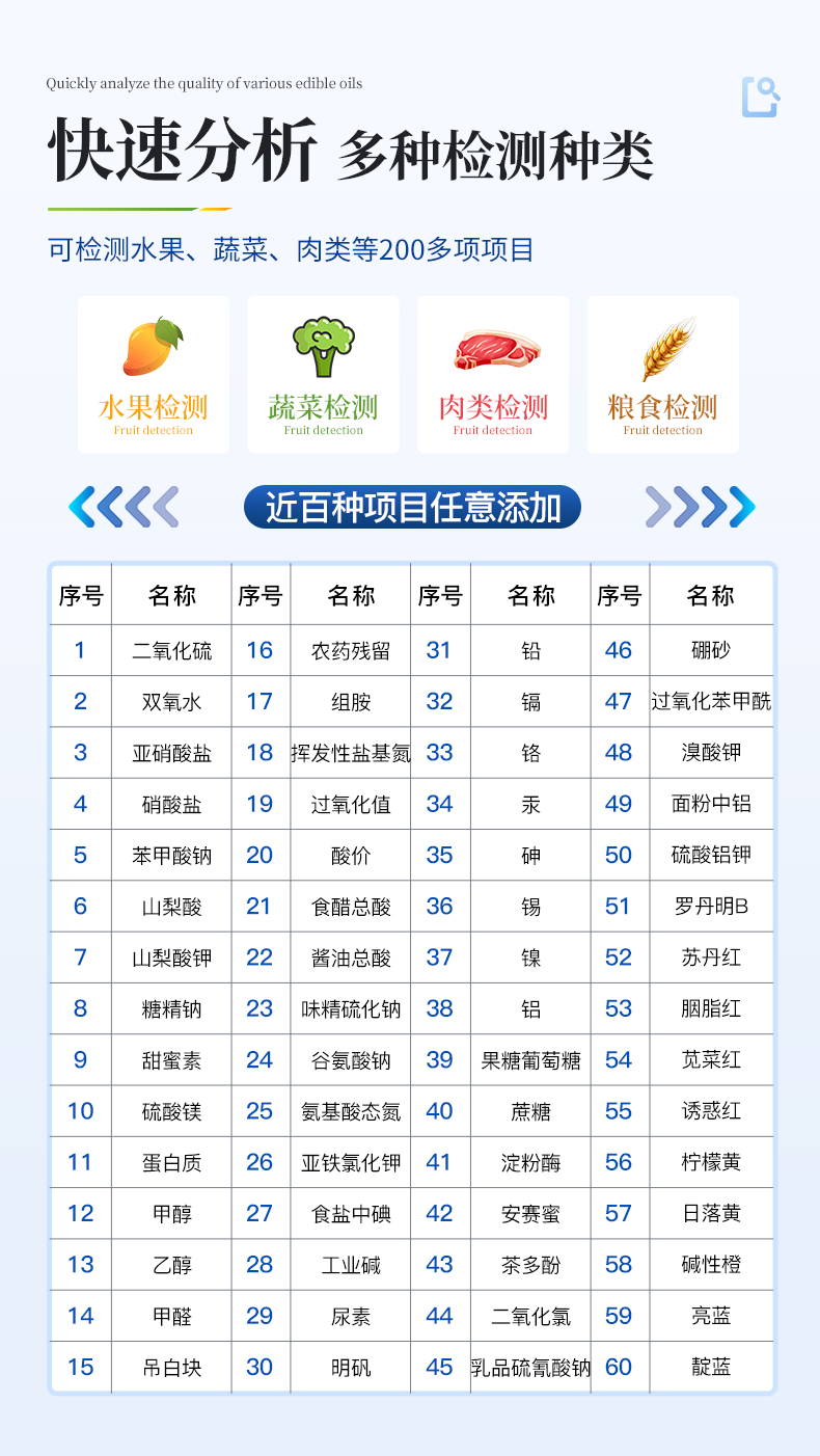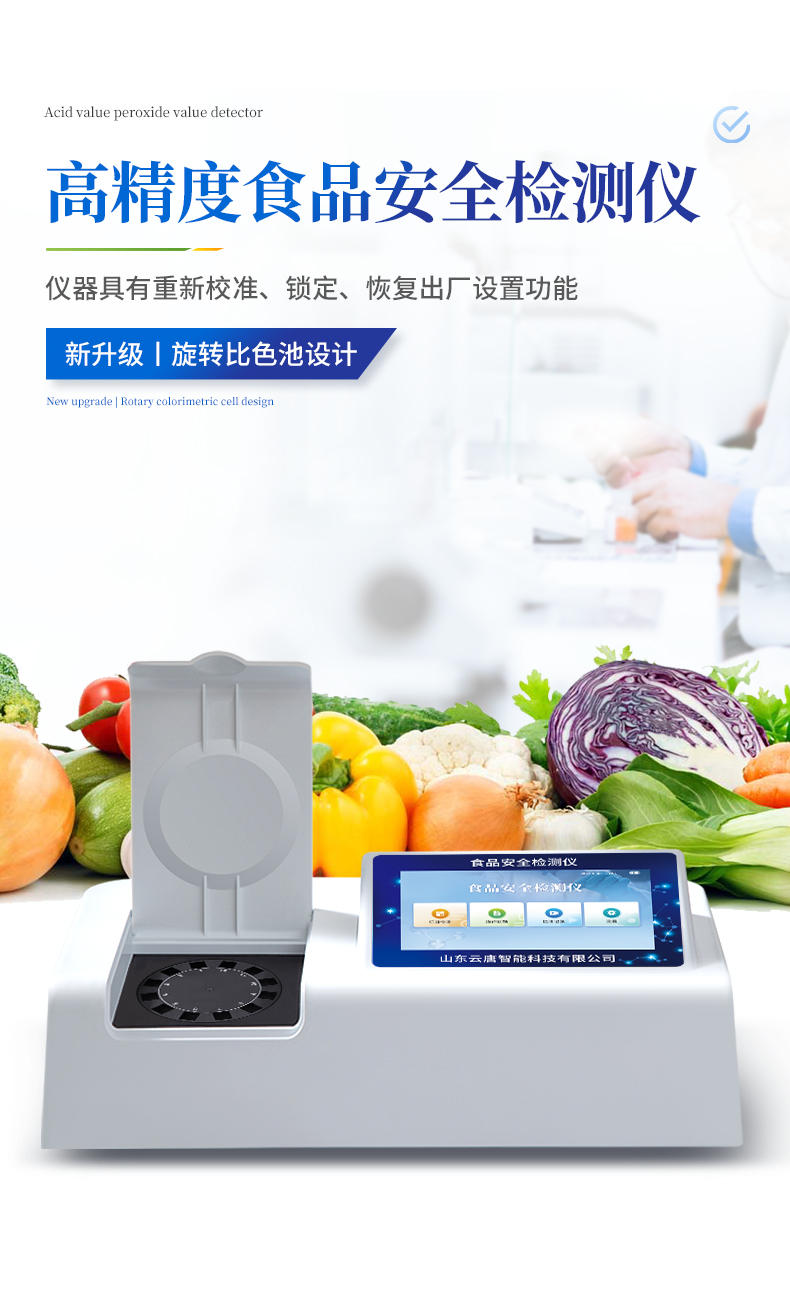 | 1、儀器采用臺(tái)式一體化系統(tǒng)檢測(cè)技術(shù),將分光光度模塊、數(shù)字化管理模塊、無(wú)線通訊模塊高度集成于一體,支持檢測(cè)幾十種食品安全檢測(cè)項(xiàng)目,同時(shí)預(yù)留升級(jí)檢測(cè)方法。 | 2、儀器檢測(cè)模塊標(biāo)準(zhǔn)化、智能化,檢測(cè)項(xiàng)目可隨意自由組合。檢測(cè)箱體內(nèi)置多個(gè)標(biāo)準(zhǔn)檢測(cè)單元,檢測(cè)模塊可以調(diào)整配置。 | 3、顯示屏幕:儀器采用7英寸液晶觸摸屏,搭配運(yùn)行安卓智能操作系統(tǒng),主控芯片采用ARM Cortex-A7,RK3288/4核處理器,主頻1.88Ghz,操作方便,性能更強(qiáng)。 | 4、檢測(cè)通道:≥12通道;采用精密旋轉(zhuǎn)比色池設(shè)計(jì),使用同芯片同光源校準(zhǔn)精度,解決不同光源之間的誤差值,更加準(zhǔn)確**。 | 5、儀器光源:高精度進(jìn)口四波長(zhǎng)冷光源,每個(gè)通道均配置 410、520、590、630nm 波長(zhǎng)光源,標(biāo)配**的光路切換裝置,專利光路切換功能可實(shí)現(xiàn)64波長(zhǎng),并且所有檢測(cè)項(xiàng)目可實(shí)現(xiàn)所有通道同時(shí)檢測(cè)。 | 6、通訊接口:配備無(wú)線通信模塊、可選配4G(APN)通訊模塊和藍(lán)牙傳輸,同時(shí)具有USB接口,可以多方式實(shí)現(xiàn)數(shù)據(jù)保存及數(shù)據(jù)傳輸。 | 7、存儲(chǔ)方式:支持U盤存儲(chǔ),標(biāo)準(zhǔn)USB接口,免驅(qū)動(dòng)安裝。檢測(cè)結(jié)果存儲(chǔ)容量20萬(wàn)條以上,可生成Excel表格進(jìn)行拷貝,并具有登錄保護(hù)功能。 | 8、智能化操作系統(tǒng): | 8.1、操作系統(tǒng):儀器可在同一檢測(cè)界面自動(dòng)對(duì)應(yīng)相關(guān)檢測(cè)通道,一次性選擇1-12個(gè)樣品名稱,無(wú)需退出界面,節(jié)省操作時(shí)間。并可以對(duì)每個(gè)通道屬性和樣品信息單獨(dú)進(jìn)行編輯,例如送檢單位、人員,檢測(cè)人員等,打印時(shí)勾選打印顯示。 | 8.2、限量規(guī)判系統(tǒng):具有限量查詢、添加物質(zhì)合規(guī)判定系統(tǒng)。檢測(cè)出結(jié)果后,系統(tǒng)自動(dòng)調(diào)用系統(tǒng)數(shù)據(jù)庫(kù)中相關(guān)國(guó)標(biāo)進(jìn)行比對(duì)判定,客觀顯示結(jié)果是否合格。 | 8.3、數(shù)據(jù)監(jiān)管系統(tǒng):同步對(duì)接監(jiān)管平臺(tái),數(shù)據(jù)可局域網(wǎng)和互聯(lián)網(wǎng)數(shù)據(jù)上傳,檢測(cè)結(jié)果可選擇直接傳至食品安全監(jiān)管平臺(tái)。進(jìn)行區(qū)域食品安全監(jiān)管及大數(shù)據(jù)分析處理與數(shù)據(jù)統(tǒng)計(jì),檢測(cè)區(qū)域食品安全長(zhǎng)短期動(dòng)態(tài),達(dá)到食品安全問(wèn)題預(yù)估、預(yù)警。 | 8.4、打印系統(tǒng):內(nèi)置全新打印機(jī),可以打印:項(xiàng)目名稱,二維碼,抽樣信息、檢測(cè)信息,受檢信息、復(fù)核信息、抽樣日期、檢測(cè)日期等信息的打印。 | 9、供電模式:儀器交直流兩用,直流12V供電(標(biāo)配),可連接車載電源,亦可選配6ah大容量充電鋰電池,電量可實(shí)時(shí)顯示,方便戶外流動(dòng)測(cè)試。 | 10、儀器具有重新校準(zhǔn)、鎖定、恢復(fù)出廠設(shè)置功能, | 11、外觀尺寸:415X310X150(mm) ,并可加配鋁合金手提箱 |
