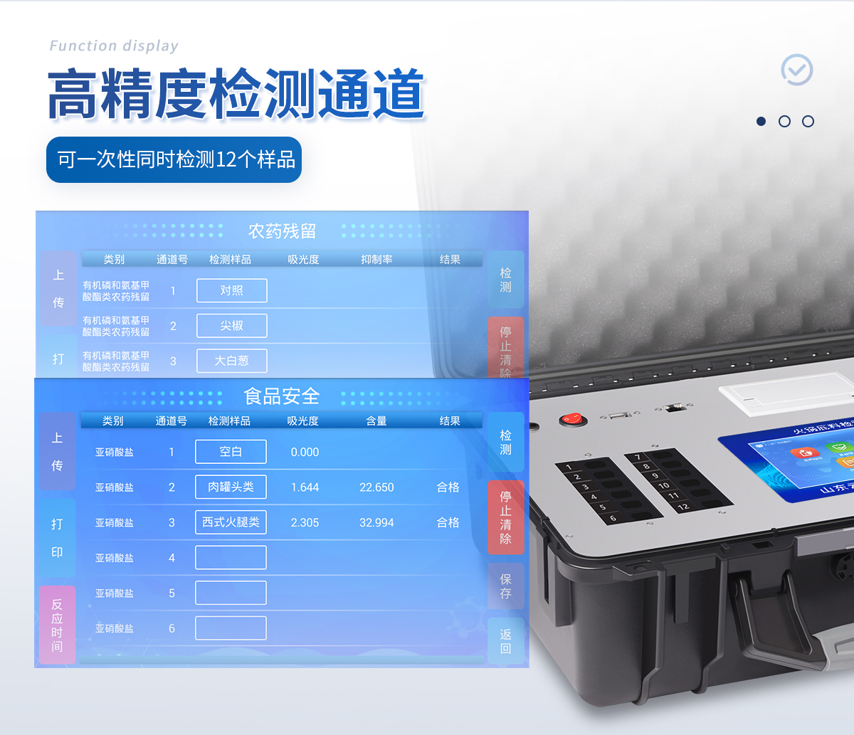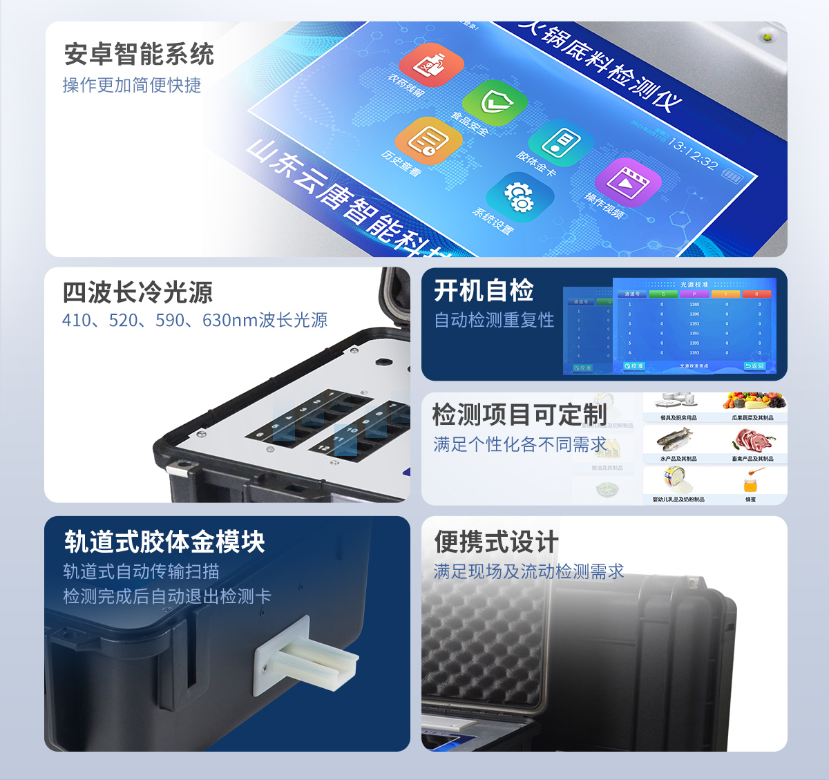 5、一體化便攜式快檢設備,滿足現場及流動檢測使用需求,能夠在同一軟件下實現所有檢測項目的檢測,并可通過同一窗口直觀顯示檢測結果。
