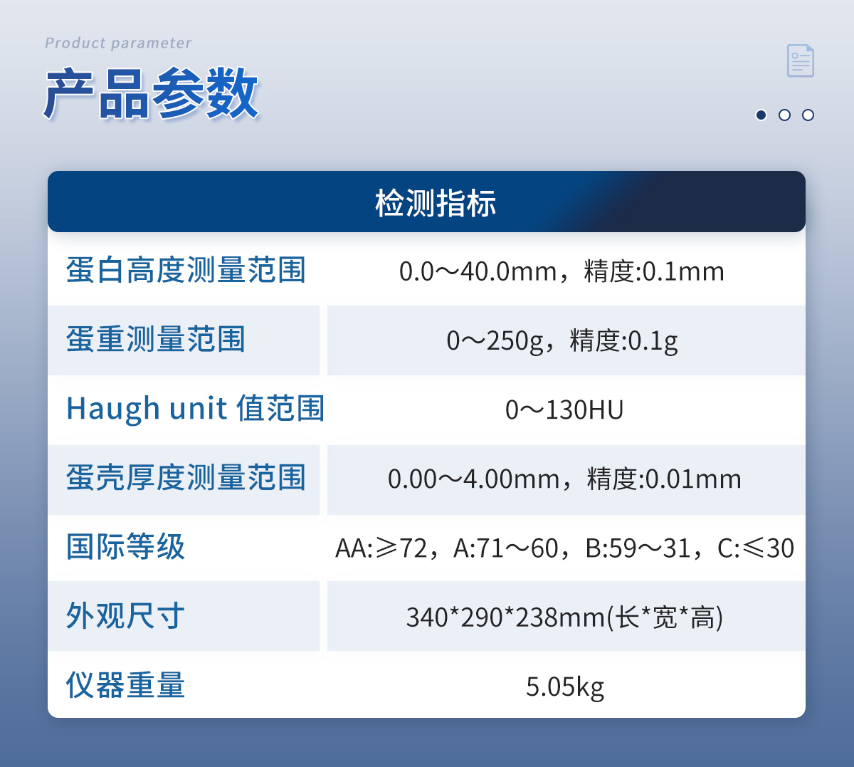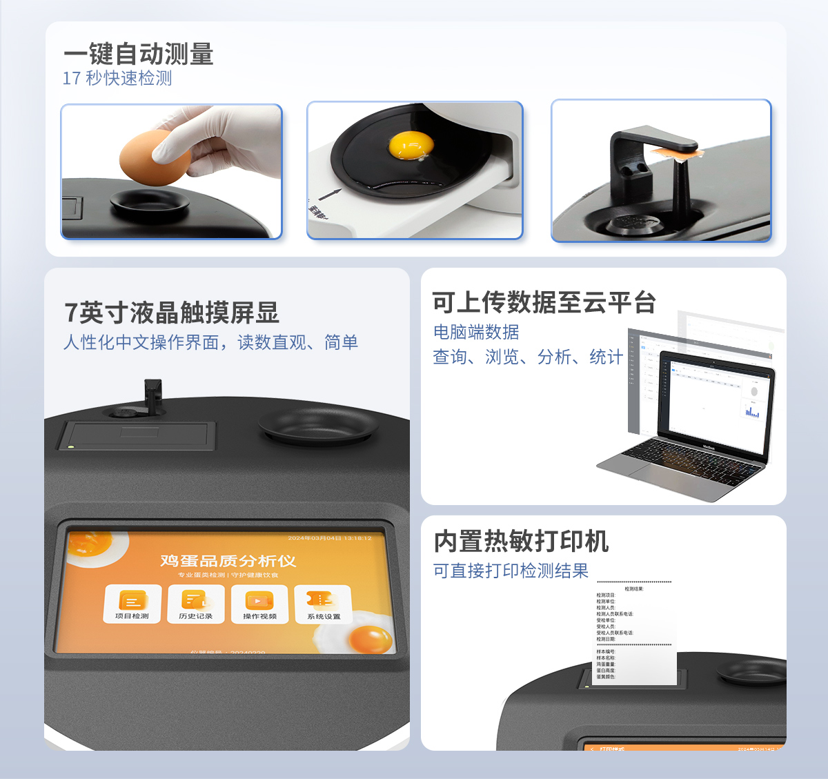 | 1.儀器采用7英寸液晶觸摸屏,搭配運(yùn)行安卓智能操作系統(tǒng),主控芯片采用ARM Cortex-A7,RK3288/4核處理器,主頻1.88Ghz,操作方便,性能更強(qiáng)。 | 2.儀器采用智能化控制,可一鍵自動測量蛋重、蛋白高度、新鮮度(哈夫單位)、蛋黃高度、蛋殼厚度。 | 3.高精度數(shù)字傳感器,測量結(jié)果精度高,穩(wěn)定性好。 | 4.創(chuàng)新采用高精超聲波傳感器測試蛋白高度,精密傳感器測試蛋黃顏色,無需直接接觸蛋液,減少誤差存在。 | 5.儀器測試性能穩(wěn)定,不受操作人員的能力影響,方便簡單。 | 6.可一鍵自動測量哈夫單位、蛋重、蛋白高度、蛋黃高度和蛋殼厚度,把測試時(shí)間縮短到 17 秒。 | 7.儀器可本機(jī)存儲數(shù)據(jù),可連接USB端口將數(shù)據(jù)導(dǎo)出存儲。另外,儀器自帶數(shù)據(jù)上傳模塊,具有WIFI聯(lián)網(wǎng)上傳、RJ45網(wǎng)線連接功能,數(shù)據(jù)可實(shí)現(xiàn)局域網(wǎng)和互聯(lián)網(wǎng)數(shù)據(jù)上傳,檢測結(jié)果可選擇直接傳至數(shù)據(jù)平臺,進(jìn)行大數(shù)據(jù)分析處理與數(shù)據(jù)統(tǒng)計(jì),達(dá)到長期分析監(jiān)測的目的。 | 8.打印系統(tǒng):內(nèi)置全新打印機(jī),可以打印項(xiàng)目名稱、二維碼、抽樣信息、檢測信息、受檢信息、復(fù)核信息、抽樣日期、檢測日期等信息。 | 9.供電模式:儀器交直流兩用,直流12V供電(標(biāo)配),可連接車載電源,亦可選配6ah大容量充電鋰電池,方便戶外流動測試。 | 10.儀器具有重新校準(zhǔn)、鎖定功能。 | 11.檢測指標(biāo): | (1)蛋白高度測量范圍:0.0~40.0mm,精度:0.1mm ; | (2)蛋重測量范圍:0~250g,精度:0.1g ; | (3) Haugh unit 值范圍:0~130HU; | (4)國際等級:AA:≥72,A:71~60,B:59~31,C:≤30; | (5)蛋殼厚度測量范圍:0.00~4.00mm,精度:0.01mm 。 | 12.外觀尺寸:340*290*238mm(長*寬*高),儀器重量:5.05kg。 |