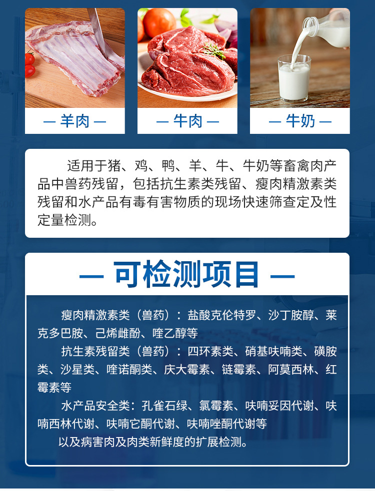 金標(biāo)度數(shù)儀可現(xiàn)場快速檢測獸藥殘留、抗生素類殘留、激素類殘留、毒素類殘留,化學(xué)類殘留等200多種項目如食品添加劑、色素、鹽酸克倫特羅、沙丁胺醇、萊克多巴胺、罌粟殼、四環(huán)素類、硝基呋喃類、磺胺類、沙星類、氯霉素、三聚氰胺、氟喹諾酮類、孔雀石綠、豬藍(lán)耳病毒、豬瘟病毒、黃曲霉毒素B1、豬偽狂犬病毒、豬偽狂犬病毒gE蛋白、豬口蹄疫3ABC蛋白、豬口蹄疫病毒IgG、豬細(xì)小病毒、雞禽流感等快速檢測。