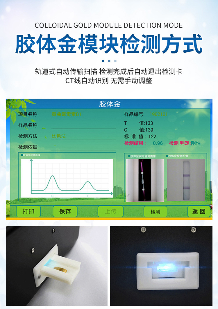 膠體金模塊檢測方式:軌道式自動傳輸掃描,檢測完成后自動退出試紙。