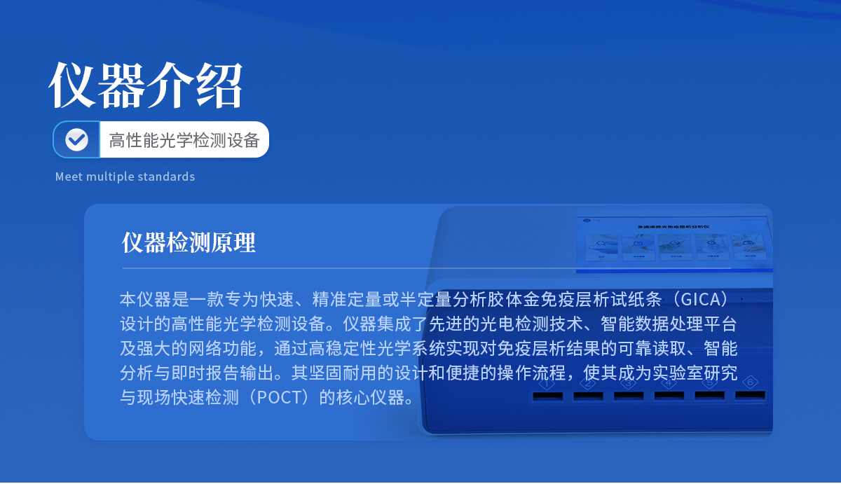 | 1、食品安全: 致病微生物、農獸藥殘留、生物毒素等快速篩查。 | 2、畜牧獸醫: 動物疫病診斷、動物源性安全指標檢測。 | 3、環境監測: 水質、土壤特定污染物篩查。 | 4、科研與生物安全: 免疫層析實驗定量分析、生物因子檢測。 | 5、其他領域: 所有使用膠體金免疫層析試紙條的場景。 |