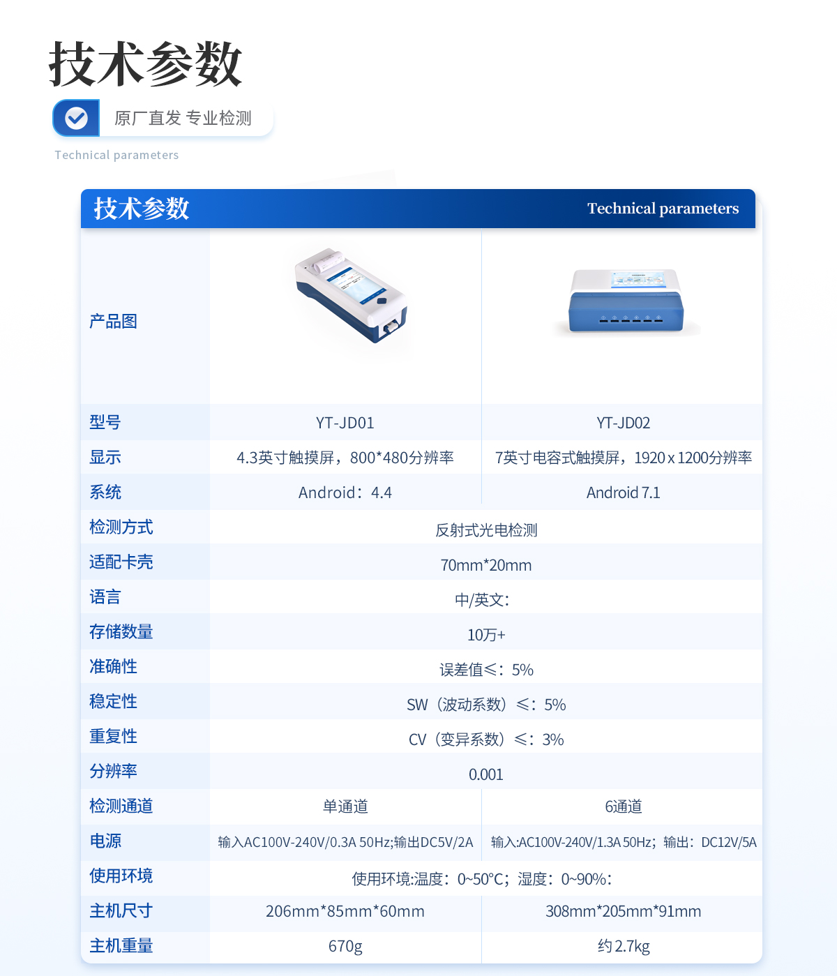 | 1、 屏幕:4.3英寸觸摸屏,分辨率:800*480,內部存儲:1+8GB | 2、 操作系統:Android:4.4 | 3、 檢測方式:反射式光電檢測 | 4、 適配卡殼:70mm*20mm | 5、 語言:中/英文: | 6、 存儲數量:10萬+ | 7、 準確性:誤差值≤:5% | 8、 穩定性:SW(波動系數)≤:5% | 9、 重復性:CV(變異系數)≤:3% | 10、 分辨率:0.001 | 11、 檢測通道:單通道 | 12、 檢測時間:<:5秒;可對樣本進行膠體金定性/半定量檢測 | 13、 插卡判斷:檢測卡未插入檢測通道不能檢測 | 14、 數據傳輸:WiFi、藍牙、Type-C | 15、 數據處理:可通過通訊端口進行數據匯總、上傳監管平臺等 | 16、 檢測通道孵育檢測一體,溫度范圍::室溫:+5℃:~:60℃ | 17、 打印機:熱敏打印機(熱敏打印紙:57*20mm) | 18、 電源:輸入AC100V-240V/0.3A 50Hz;輸出DC5V/2A | 19、 電池容量:6000mah: | 20、 顯示電量 | 21、 使用環境:溫度:0~50℃;濕度:0~90%: | 22、 主機尺寸::206mm*85mm*60mm | 23、 主機重量:670g |
