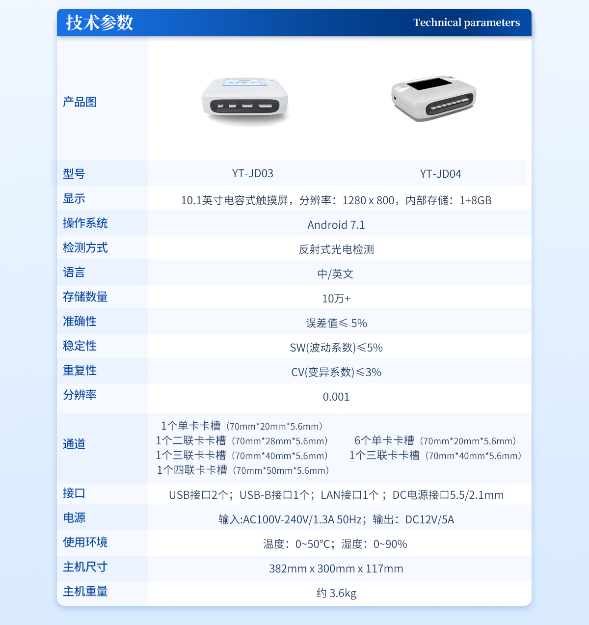 | 1、 7英寸電容式觸摸屏,分辨率:1920:x:1200,內(nèi)部存儲:1+8GB | 2、 操作系統(tǒng):Android:7.1 | 3、 檢測方式:反射式光電適配卡殼:70mm*20mm | 4、 語言:中/英文: | 5、 存儲數(shù)量:10萬+ | 6、 準確性:誤差值≤:5% | 7、 穩(wěn)定性:SW(波動系數(shù))≤5% | 8、 重復(fù)性:CV(變異系數(shù))≤3% | 9、 分辨率:0.001 | 10、檢測通道:6通道檢測時間:<5秒(單卡及多聯(lián)卡);可對樣本進行膠體金定性/半定量檢測。 | 11、數(shù)據(jù)傳輸:WiFi、藍牙、USB、射頻讀卡、外置掃碼模塊(選配) | 12、數(shù)據(jù)處理:可通過通訊端口進行數(shù)據(jù)匯總、上傳監(jiān)管平臺等 | 13、檢測通道孵育檢測一體,溫度范圍::室溫:+5℃:~:60℃ | 14、打印機:熱敏打印機(熱敏打印紙:57*20mm) | 15、接口:USB接口:2個;USB-B接口:1個;LAN接口:1個:;DC電源接口:5.5/2.1mm | 16、電源:輸入:AC100V-240V/1.3A 50Hz;輸出:DC12V/5A | 17、使用環(huán)境:溫度:0~50℃;濕度:0~90%: | 18、主機尺寸::308mm*205mm*91mm | 19、主機重量:約:2.7kg |