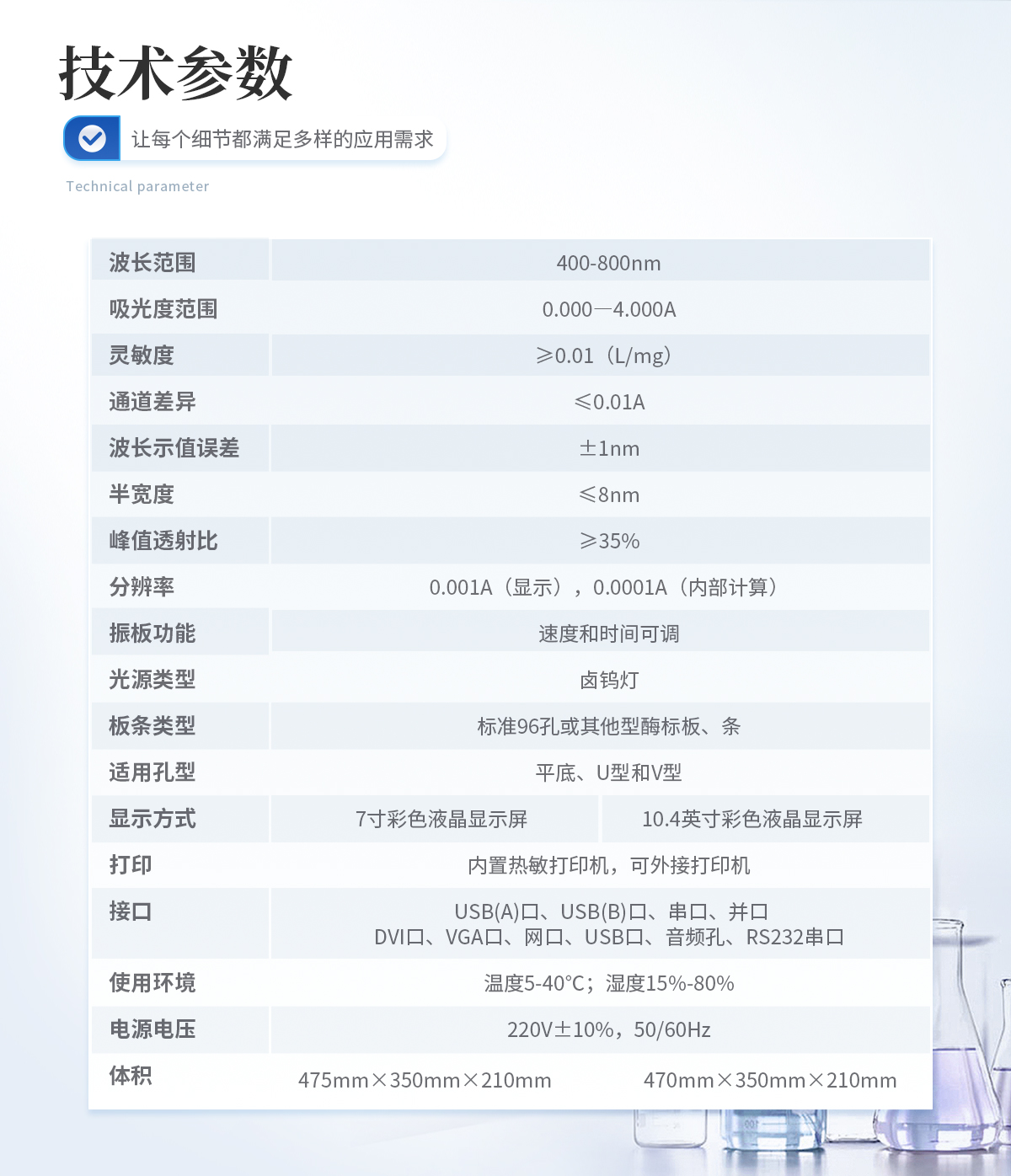 | *波長范圍: 400-800nm | *濾光片配置:10個(gè)濾光片位置,標(biāo)配405nm、450nm、492nm、630nm,選配6定制波長 | 吸光度范圍:0.000―4.000A | *光通道數(shù):8通道光路檢測,另設(shè)一個(gè)獨(dú)立參比通道(選配) | *示值穩(wěn)定性:≤±0.002A或≤0.5%T/10min。 | *示值誤差(準(zhǔn)確性):≤±0.005A或±0.2%T。 | *重復(fù)性:≤0.2%或≤0.2%T。 | 靈敏度:≥0.01(L/mg)。 | 通道差異:≤0.01A。 | 波長示值誤差:±1nm | 半寬度:≤8nm | 峰值透射比:≥35% | 分辨率:0.001A(顯示),0.0001A(內(nèi)部計(jì)算) | *讀板速度:單波長≤3秒/96孔,雙波長≤6秒/96孔 | 振板功能:速度和時(shí)間可調(diào) | 光源類型:鹵鎢燈 | 板條類型:標(biāo)準(zhǔn)96孔或其他型酶標(biāo)板、條 | 適用孔型:平底、U型和V型 | 顯示方式:7寸彩色液晶顯示屏顯示 | 輸入方式:觸摸屏輸入,可選配鼠標(biāo)和鍵盤 | 打印:內(nèi)置熱敏打印機(jī),可外接打印機(jī) | 接 口: USB(A)口、USB(B)口、串口、并口 | *數(shù)據(jù)儲存:200,000個(gè)測試數(shù)據(jù),500個(gè)以上測試項(xiàng)目(可擴(kuò)展) | 使用環(huán)境:溫度5-40℃;濕度15%-80% | 電源電壓:220V±10%,50/60Hz | 體積:475mm×350mm×210mm(長×寬×高) | 重量:11.5Kg |