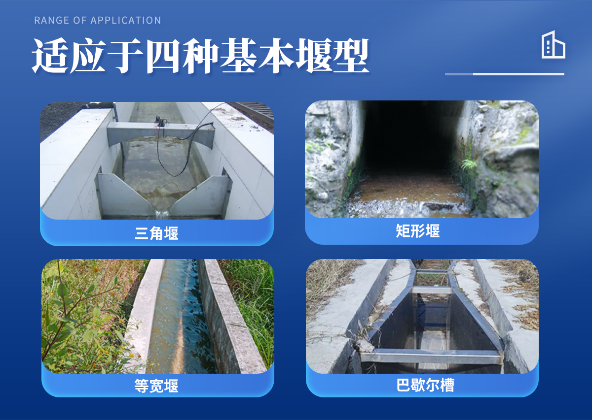 適應于四種基本堰型:三角堰、 矩形堰、 等寬堰、 巴歇爾槽