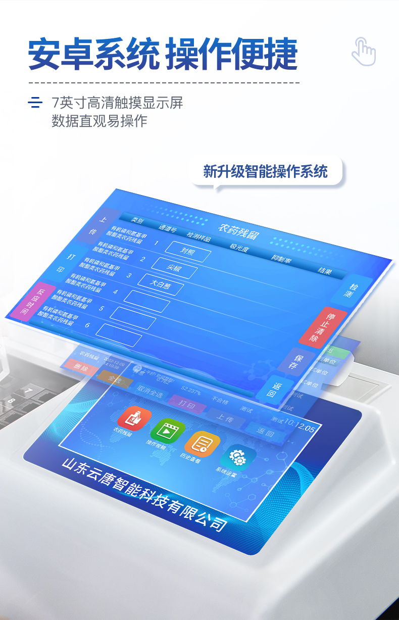 | 安卓智能操作系統(tǒng),采用更加**和人性化操作,儀器具有無線聯(lián)網(wǎng)上傳功能,快速上傳數(shù)據(jù),進(jìn)行數(shù)據(jù)統(tǒng)計和分析。 | 智能化程度高,儀器具有自檢功能:具有開機(jī)自檢和調(diào)零功能,具有自動檢測重復(fù)性功能;同時,檢測完成可自動打印檢測報告和二維碼。手機(jī)掃碼可顯示出詳細(xì)檢測信息。 | 儀器帶有監(jiān)管平臺,數(shù)據(jù)可局域網(wǎng)和互聯(lián)網(wǎng)數(shù)據(jù)上傳,檢測結(jié)果直接傳至食品安全監(jiān)管平臺。進(jìn)行區(qū)域食品安全監(jiān)管及大數(shù)據(jù)分析處理與數(shù)據(jù)統(tǒng)計,檢測區(qū)域食品安全長短期動態(tài),達(dá)到食品安全問題預(yù)估、預(yù)警 。 | 樣品處理簡單省力,整體操作快速、安全、便捷。 | 儀器具有自身保護(hù)功能,可設(shè)置用戶名及密碼,防止非工作人員操作等。 | 內(nèi)置強(qiáng)大的數(shù)據(jù)庫,可在儀器上直接選擇樣品名稱、檢測指標(biāo)、送檢單位等信息,也可在儀器上直接編輯錄入樣品名稱、檢測指標(biāo)、送檢單位等信息并保存進(jìn)樣品數(shù)據(jù)庫,方便后期操作調(diào)取使用。 | 儀器具有重新校準(zhǔn)、鎖定、恢復(fù)出廠設(shè)置功能。 |