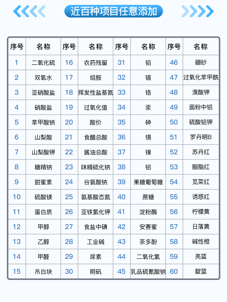 | 農(nóng) 殘 | 甲 醛 | 亞硝酸鹽 | 二氧化硫 | 吊 白 塊 | 蛋 白 質(zhì) | 硼 砂 | 雙 氧 水 | 硝 酸 鹽 | lett 重金屬鉛 |