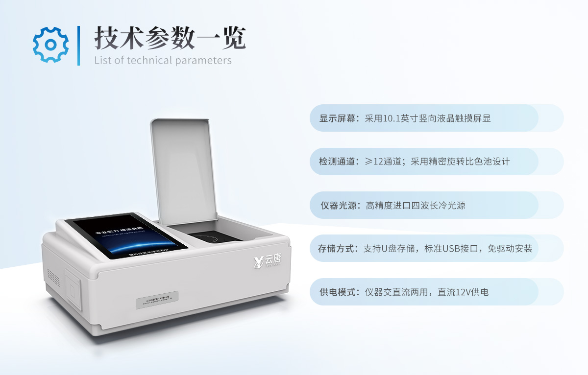 | 儀器采用臺式一體化系統檢測技術,將分光光度模塊、膠體金檢測模塊、新型農殘檢測模塊、數字化管理模塊、無線通訊模塊高度集成于一體,支持檢測200種食品安全檢測項目,同時預留升級檢測方法。 | 儀器檢測模塊標準化、智能化,可隨意自由組合。檢測箱體內置多個標準檢測單元,檢測模塊可以調整配置。 | 儀器采用全新安卓智能系統,主控芯片采用 ARM Cortex-A7,RK3288/4核處理器,10.1寸高清液晶觸摸豎屏,更加**的UI交互界面,運轉快捷;儀器配備無線通信模塊: 4G(APN)通訊模塊、Wifi模塊,藍牙傳輸,同時具有雙USB接口以及RJ45接口能以多種方式實現數據保存和數據傳輸功能。 | 創新檢測模式★檢測通道:≥12通道;采用精密旋轉比色池設計,使用同芯片同光源校準精度,解決不同光源之間的誤差值。1-12通道間誤差0.1%。(***:**202022821055.2) ★儀器具有自動識別比色皿檢測功能,即:將樣品比色皿放入儀器后,點擊樣品檢測,儀器自動識別比色皿進行通道檢測。 | 進口高精光源:高精度進口四波長冷光源,通道配置 410、520、590、630nm 波長光源,一個光源芯片驅動一個光源,誤差極小,每臺設備單獨**校準光源,**比對,同時參照四種不同波段光源全方位覆蓋市面上99%的農殘食品項目檢測。 | 膠體金模塊檢測方式:★采用COMS實時成像技術,可采集多個畫面,支持2個金標同時讀卡,通過不同顏色的灰度變化,一秒精準得出結果。 | 智能操作分析系統: | ★便捷操作系統:設備檢測時可在同一檢測界面自動對應相關檢測通道一次性選擇1-12個樣品名稱,無須退出界面,節省操作時間。(需提供對應證明) | ★數據集成系統:設備首頁自動統計檢測數據包含:周檢測數據、月檢測數據,全部檢測總數量,均包含檢測總數,合格數,不合格數,以及相關柱形分析圖,對各項檢測數據清晰掌握,無需電腦查詢,更加快捷直觀。(需提供對應證明文件) | ★項目預設系統:支持添加單個及多個相同或不相同的任務預設,一鍵快速調取,每一個任務分別可以設置不同的樣品、批次、編號、來源、備注、抽樣信息、檢測信息、受檢信息、復核信息等更多信息。無縫鏈接平臺和APP實時查看下發任務。(需提供對應證明文件) | ★數據監管系統:同步對接監管平臺,數據可局域網和互聯網數據上傳,檢測結果可選擇直接傳至食品安全監管平臺。集成OSS輸出存儲服務、區分設備定向管理應用,進行區域食品安全監管及大數據分析處理與數據統計,檢測區域食品安全長短期動態,達到食品安全問題預估、預警。(需提供對應食品理化分析系統計算機軟件著作權)。 | ★ 自定義打印系統:內置全新打印系統,新創自定義打印方式,可按需靈活設置開啟或關閉:產品合格證(國家農業部標準要求),二維碼,抽樣信息、檢測信息,受檢信息、復核信息、抽樣日期、檢測日期等信息的打印。(需提供對應證明) | ★系統遠程更新功能:可定向分客戶分儀器更新系統,按照不同客戶后期實際需求添加項目,無需機器返廠,即可遠程實時升級全新系統,節省時間成本及避免運輸造成設備損壞。 | 儀器主機采用一體化防水、抗壓、防撞擊、防腐蝕箱體設計,同時配備交直流供電,可連接車載電源,可選配大容量充電鋰電池,滿足現場野外檢測需求。 | 安全證書,放心保障:儀器具有中國計量科學研究院校準證書,權威認證。 |
