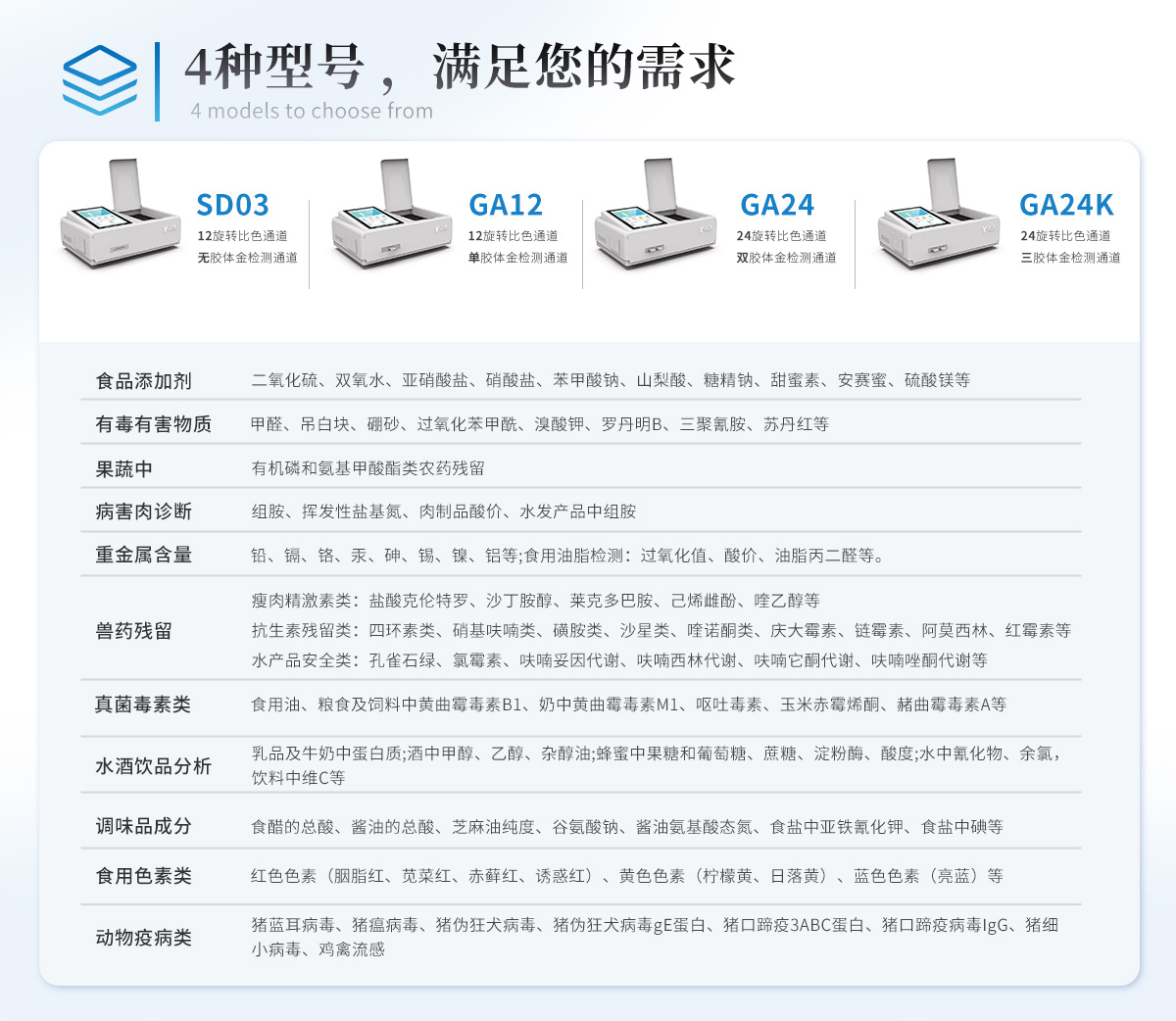| 食品添加劑:二氧化硫、雙氧水、亞硝酸鹽、硝酸鹽、苯甲酸鈉、山梨酸鉀、糖精鈉、甜蜜素、木耳硫酸鎂等 | 有毒有害物質:甲醛、吊白塊、硼砂、過氧化苯甲酰、溴酸鉀、羅丹明B、三聚氰胺、蘇丹紅、工業堿、尿素、明礬等 | 食用油脂:過氧化值、酸價等 | 果蔬:農藥殘留(酶抑制率法) | 病害肉:組胺、揮發性鹽基氮 | 重金屬含量:鉛、鎘、鉻、汞、砷、錫、鎳、鋁等 | 水酒飲品分析:酒中甲醇、乙醇、乳品及牛奶中蛋白質, | 蜂蜜成分:果糖和葡萄糖、蔗糖、淀粉酶、酸度等 | 調味品成分:食醋的總酸、醬油的總酸、芝麻油純度、谷氨酸鈉、醬油氨基酸態氮、食鹽中亞鐵氰化鉀、食鹽中碘等 | 食用色素類:紅色色素(胭脂紅、莧菜紅、莧菜紅)、黃色色素(檸檬黃、日落黃)、藍色色素(亮藍)等 |