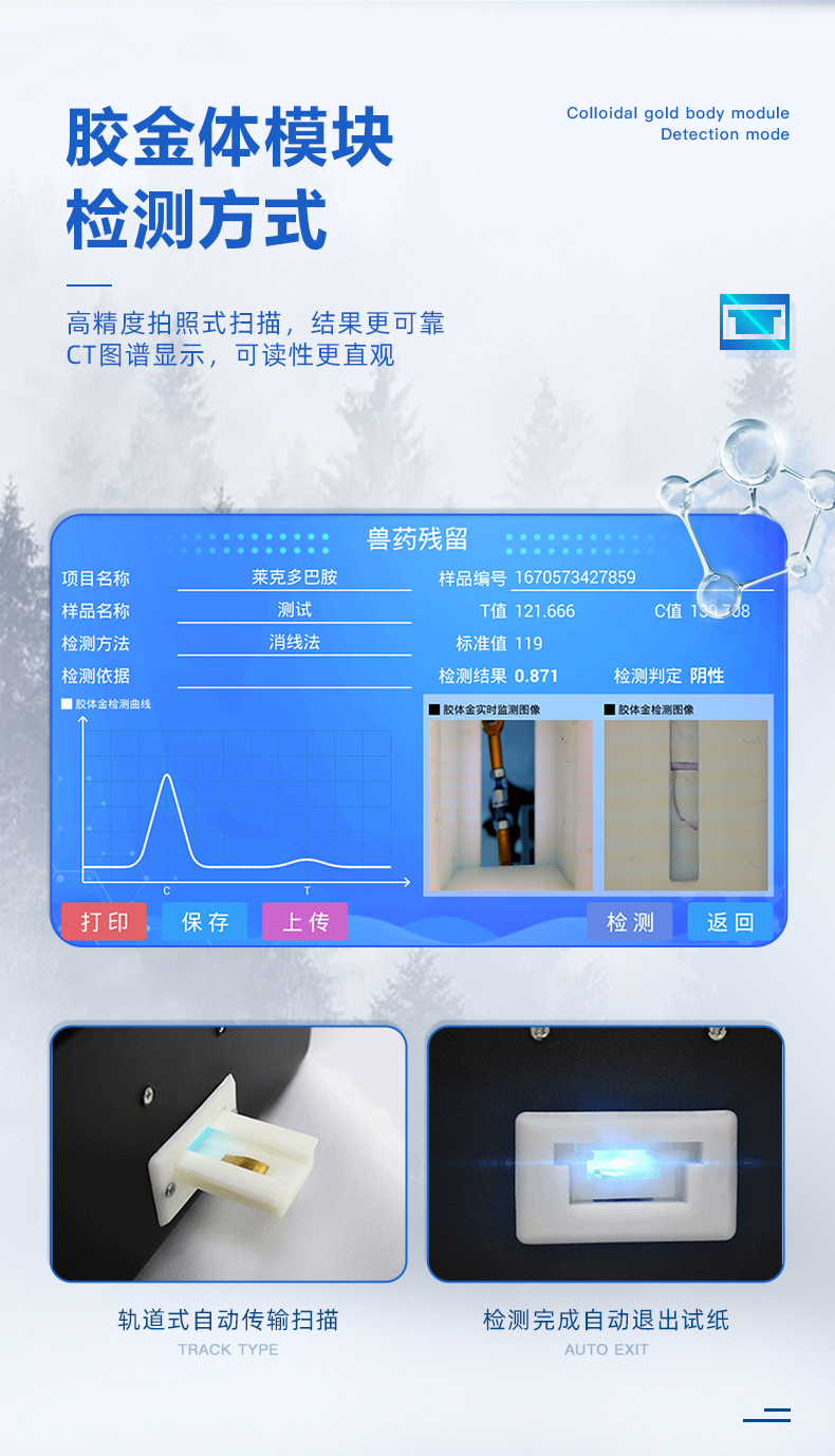 | 儀器采用手提式一體化系統(tǒng)檢測(cè)技術(shù),將分光光度模塊、膠體金檢測(cè)模塊、新型農(nóng)殘檢測(cè)模塊、數(shù)字化管理模塊、無(wú)線通訊模塊高度集成于一體,支持檢測(cè)200種食品安全檢測(cè)項(xiàng)目,同時(shí)預(yù)留升級(jí)檢測(cè)方法。 | 儀器檢測(cè)模塊標(biāo)準(zhǔn)化、智能化,檢測(cè)項(xiàng)目可隨意自由組合。檢測(cè)箱體內(nèi)置多個(gè)標(biāo)準(zhǔn)檢測(cè)單元,檢測(cè)模塊可以調(diào)整配置。 | 顯示屏幕:儀器采用10.1英寸液晶觸摸屏顯,搭配運(yùn)行安卓智能操作系統(tǒng),主控芯片采用ARM Cortex-A7,RK3288/4核處理器,主頻1.88Ghz,運(yùn)轉(zhuǎn)速度更快速,性能更強(qiáng)。 | 檢測(cè)通道:≥12通道;采用精密旋轉(zhuǎn)比色池設(shè)計(jì),使用光源芯片一致,可以解決各通道間由于光源芯片不同帶來(lái)的檢測(cè)結(jié)果誤差問(wèn)題,檢測(cè)結(jié)果更加精準(zhǔn),1-12通道間誤差0.1%,***:**202022821055.2。 | 儀器光源:高精度進(jìn)口四波長(zhǎng)冷光源,每個(gè)通道均配置 410、520、590、630nm 波長(zhǎng)光源,標(biāo)配**的光路切換裝置,專(zhuān)利光路切換功能可實(shí)現(xiàn)*多64波長(zhǎng),并且所有檢測(cè)項(xiàng)目可實(shí)現(xiàn)所有通道同時(shí)檢測(cè)。 | 設(shè)備具備開(kāi)機(jī)自動(dòng)校準(zhǔn)及一鍵校準(zhǔn)功能,確保檢測(cè)數(shù)據(jù)結(jié)果準(zhǔn)確。 | 通訊接口:配備無(wú)線通信模塊、4G(APN)通訊模塊、藍(lán)牙傳輸,同時(shí)具有雙USB接口以及RJ45網(wǎng)線接口,可以多方式實(shí)現(xiàn)數(shù)據(jù)保存及數(shù)據(jù)傳輸。 | 存儲(chǔ)方式:支持U盤(pán)存儲(chǔ),標(biāo)準(zhǔn)USB接口,免驅(qū)動(dòng)安裝。檢測(cè)結(jié)果存儲(chǔ)容量20萬(wàn)條以上,可生成Excel表格進(jìn)行拷貝,并具有登錄保護(hù)功能。 | 智能化操作系統(tǒng): 操作系統(tǒng):可在同一檢測(cè)界面自動(dòng)對(duì)應(yīng)相關(guān)檢測(cè)通道,一次性選擇1-12個(gè)樣品名稱(chēng),無(wú)需退出界面,節(jié)省操作時(shí)間。檢測(cè)通道可以分別打開(kāi)與關(guān)閉并對(duì)檢測(cè)通道屬性和樣品信息進(jìn)行編輯,例如送檢單位、人員,檢測(cè)人員等,打印時(shí)一并顯示。 數(shù)據(jù)集成系統(tǒng):設(shè)備首頁(yè)自動(dòng)統(tǒng)計(jì)檢測(cè)數(shù)據(jù),包含:周檢測(cè)數(shù)據(jù)、月檢測(cè)數(shù)據(jù),全部檢測(cè)總數(shù)量,均包含檢測(cè)總數(shù),合格數(shù),不合格數(shù),以及相關(guān)柱形分析圖,對(duì)各項(xiàng)檢測(cè)數(shù)據(jù)清晰掌握,無(wú)需電腦查詢(xún),更加快捷直觀。 數(shù)據(jù)庫(kù)系統(tǒng):具有多品類(lèi)多種類(lèi)樣品菜單功能,并且構(gòu)建了完善的檢索、修訂功能。食品庫(kù)涵蓋多種菜單庫(kù)100多種蔬菜名稱(chēng),可按需添加或刪除、編輯蔬菜名稱(chēng);不同的檢測(cè)通道可同時(shí)檢測(cè)不同的樣品,產(chǎn)品數(shù)據(jù)庫(kù)以及歷史檢測(cè)記錄支持一鍵檢索功能。 限量規(guī)判系統(tǒng):具有限量查詢(xún)、添加物質(zhì)合規(guī)判定系統(tǒng)。檢測(cè)出結(jié)果后,系統(tǒng)自動(dòng)調(diào)用系統(tǒng)數(shù)據(jù)庫(kù)中相關(guān)國(guó)標(biāo)進(jìn)行比對(duì)判定,客觀顯示判定結(jié)果是否合格。 項(xiàng)目預(yù)設(shè)系統(tǒng):儀器具有任務(wù)預(yù)設(shè)模塊,可在樣品送檢前提前預(yù)設(shè)樣品名稱(chēng)、檢測(cè)指標(biāo)、送檢單位、檢測(cè)單位等信息,樣品送檢時(shí)一鍵調(diào)取保存信息,并可多次調(diào)取,大大提高檢測(cè)效率。 數(shù)據(jù)監(jiān)管系統(tǒng):同步對(duì)接監(jiān)管平臺(tái),數(shù)據(jù)可局域網(wǎng)和互聯(lián)網(wǎng)數(shù)據(jù)上傳,檢測(cè)結(jié)果可選擇直接傳至食品安全監(jiān)管平臺(tái)。進(jìn)行區(qū)域食品安全監(jiān)管及大數(shù)據(jù)分析處理與數(shù)據(jù)統(tǒng)計(jì),檢測(cè)區(qū)域食品安全長(zhǎng)短期動(dòng)態(tài),達(dá)到食品安全問(wèn)題預(yù)估、預(yù)警。 自定義打印系統(tǒng):內(nèi)置熱敏打印機(jī);系統(tǒng)打印格式多樣化,產(chǎn)品合格證(國(guó)家農(nóng)業(yè)部標(biāo)準(zhǔn)要求),二維碼,抽樣信息、檢測(cè)信息,受檢信息、復(fù)核信息、抽樣日期、檢測(cè)日期等信息結(jié)果,可按實(shí)際需求自行設(shè)置開(kāi)啟或關(guān)閉,并完成打印。 | 供電模式:儀器主機(jī)采用一體化防水、抗壓、防撞擊、防腐蝕機(jī)體設(shè)計(jì),可直接使用交流電源;內(nèi)置6ah大容量充電鋰電池,可連續(xù)使用8小時(shí)以上,滿(mǎn)足脫電情況下檢測(cè)需求。 | 膠體金檢測(cè)模塊: 采用雙通道CMOS成像處理技術(shù)及膠體金免疫層析技術(shù),可同時(shí)讀取雙膠體金卡數(shù)據(jù),自動(dòng)采集、處理分析,將檢測(cè)結(jié)果顯示,并可根據(jù)參考限值自動(dòng)判斷檢測(cè)結(jié)果,可檢測(cè)常見(jiàn)的獸藥殘留、生物毒素、抗生素、違禁添加物等。 探測(cè)技術(shù):CMOS成像探測(cè); 檢測(cè)通道:3通道,可同時(shí)讀取3個(gè)膠體金卡數(shù)據(jù); 檢測(cè)方式:消線法和比色法; 顯示模式:陰性或陽(yáng)性; 曲線形式:軌道式自動(dòng)傳輸掃描方式,可實(shí)時(shí)顯示金標(b