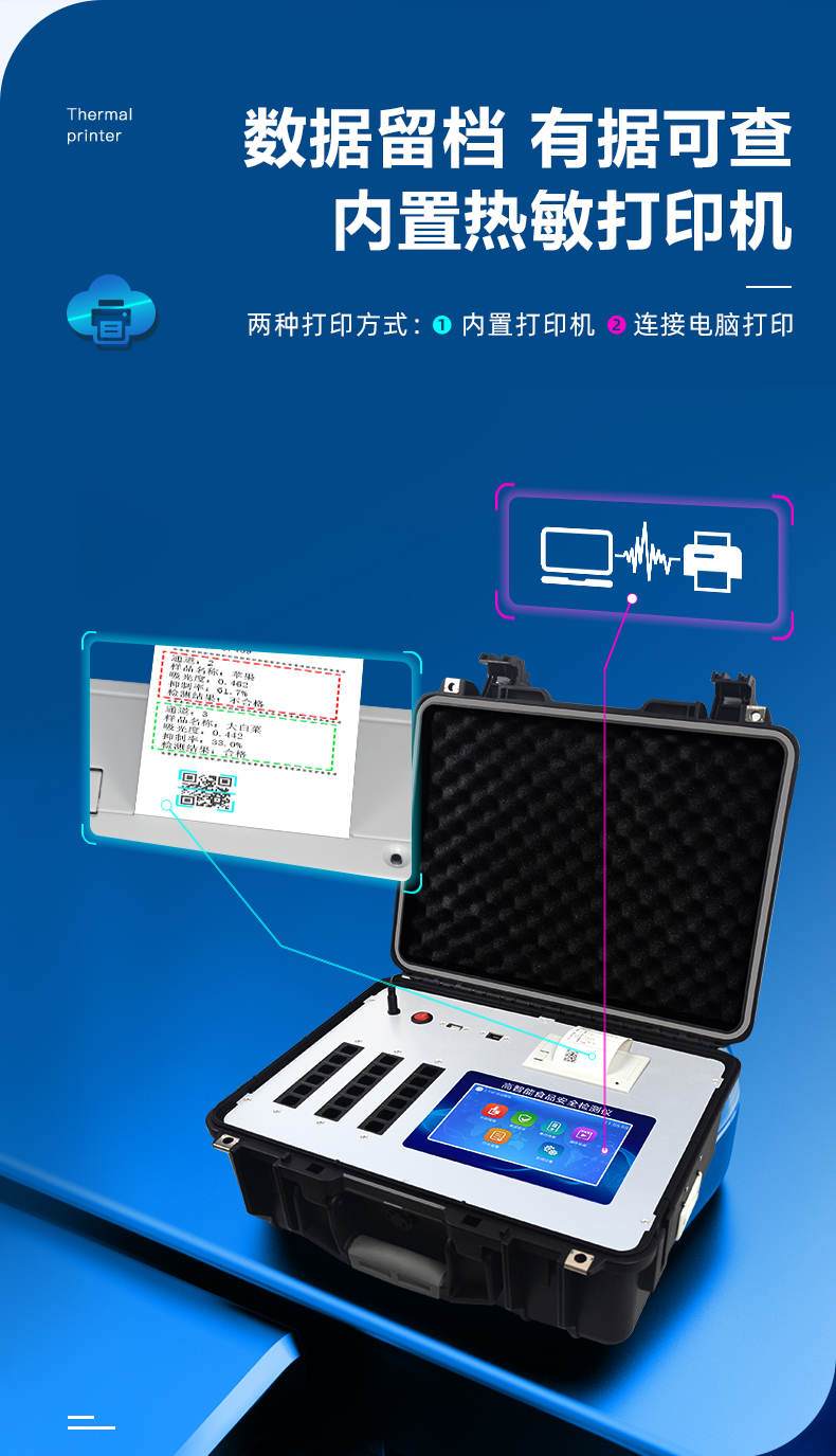 自定義打印系統:內置熱敏打印機;系統打印格式多樣化,產品合格證(國家農業部標準要求),二維碼,抽樣信息、檢測信息,受檢信息、復核信息、抽樣日期、檢測日期等信息結果,可按實際需求自行設置開啟或關閉,并完成打印。