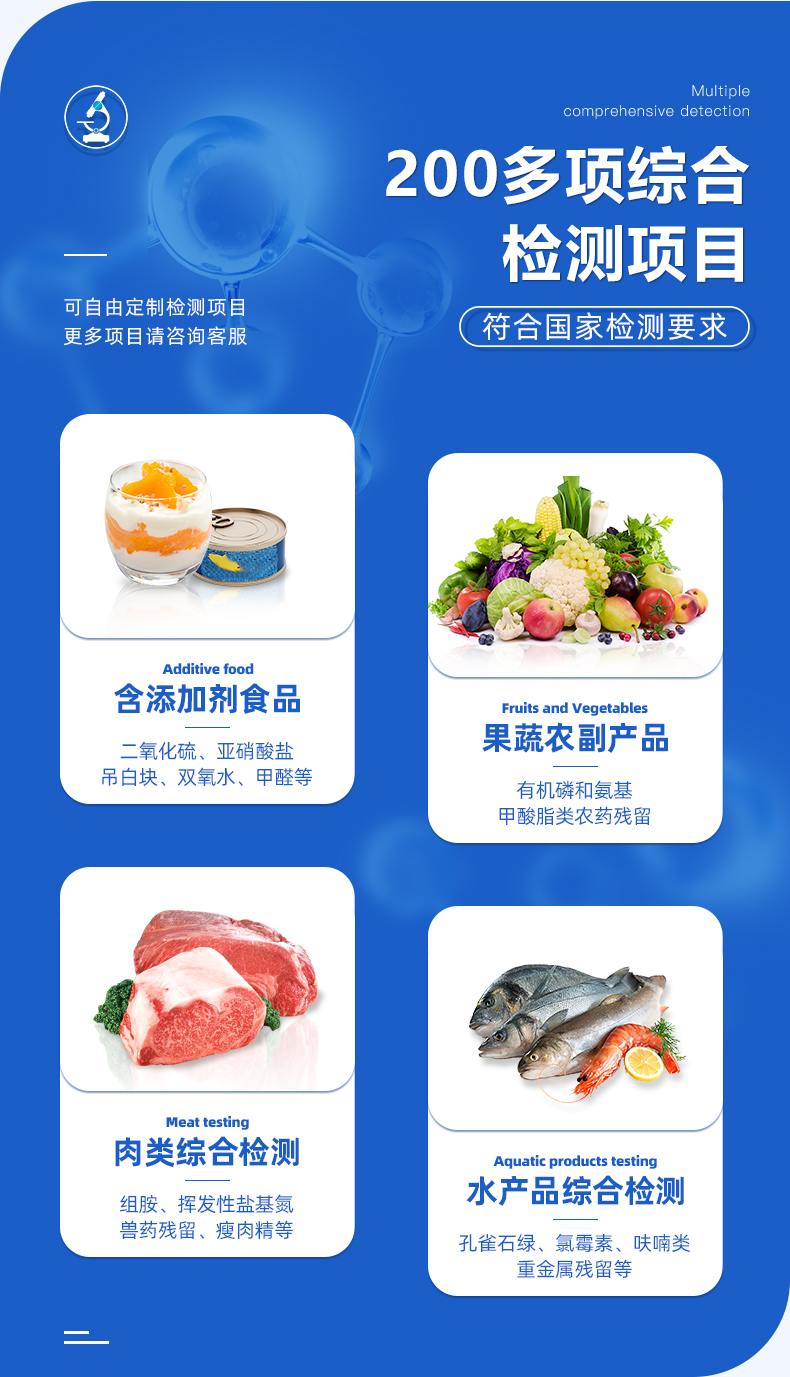 食品添加劑:二氧化硫、雙氧水、亞硝酸鹽、硝酸鹽、苯甲酸鈉、山梨酸、糖精鈉、甜蜜素、安賽蜜、硫酸鎂等有毒有害物質:甲醛、吊白塊、硼砂、過氧化苯甲酰、溴酸鉀、羅丹明B、三聚氰胺、蘇丹紅等瓜果蔬菜藥殘:農藥殘留(酶抑制率法)病害肉診斷:組胺、揮發性鹽基氮、肉制品酸價、水發產品中組胺重金屬含量:鉛、鎘、鉻、汞、砷、錫、鎳、鋁等;食用油脂檢測:過氧化值、酸價、油脂丙二醛等。食用油脂檢測::過氧化值、酸價等瘦肉精激素類(獸藥):鹽酸克倫特羅、沙丁胺醇、萊克多巴胺、己烯雌酚等抗生素殘留類(獸藥):四環素類、硝基呋喃類、磺胺類、β-興奮劑類、沙星類、磺胺類、喹諾酮類,甲砜霉素,氟苯尼考,金剛烷胺、替米考星、慶大霉素、林可霉素、鏈霉素、恩諾沙星、環丙沙星、頭孢啦啶、青霉素、阿莫西林等真菌毒素類:食用油、糧食及飼料中黃曲霉毒素B1、奶中黃曲霉毒素M1、嘔吐毒素、玉米赤霉烯酮、赭曲霉毒素A等水酒飲品分析:乳品及牛奶中蛋白質;酒中甲醇、乙醇、雜醇油;蜂蜜中果糖和葡萄糖、蔗糖、淀粉酶、酸度;水中氰化物、余氯,飲料中維C等調味品成分:食醋的總酸、醬油的總酸、芝麻油純度、谷氨酸鈉、醬油氨基酸態氮、食鹽中亞鐵氰化鉀、食鹽中碘等食用色素類:紅色色素(胭脂紅、莧菜紅、赤蘚紅、誘惑紅)、黃色色素(檸檬黃、日落黃)、藍色色素(亮藍)等動物疫病類:豬藍耳病毒、豬瘟病毒、豬偽狂犬病毒、豬偽狂犬病毒gE蛋白、豬口蹄疫3ABC蛋白、豬口蹄疫病毒IgG、豬細小病毒、雞禽流感等蜂蜜中:果糖和葡萄糖、蔗糖、淀粉酶、酸度等水產品安全類:孔雀石綠、氯霉素、呋喃妥因、呋喃西林、呋喃它酮、呋喃唑酮等