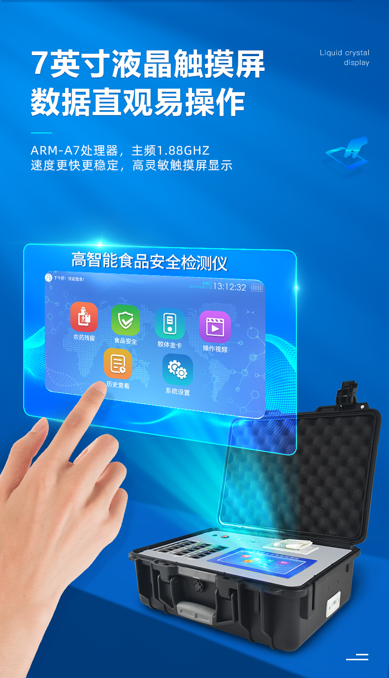 儀器采用手提式一體化系統檢測技術,將分光光度模塊、膠體金檢測模塊、新型農殘檢測模塊、數字化管理模塊、無線通訊模塊高度集成于一體,支持檢測200種食品安全檢測項目,同時預留升級檢測方法。儀器檢測模塊標準化、智能化,檢測項目可隨意自由組合。檢測箱體內置多個標準檢測單元,檢測模塊可以調整配置。 顯示屏幕:儀器采用10.1英寸液晶觸摸屏顯,搭配運行安卓智能操作系統,主控芯片采用ARM Cortex-A7,RK3288/4核處理器,主頻1.88Ghz,運轉速度更快速,性能更強。檢測通道:≥12通道;采用精密旋轉比色池設計,使用光源芯片一致,可以解決各通道間由于光源芯片不同帶來的檢測結果誤差問題,檢測結果更加精準,1-12通道間誤差0.1%,***:**202022821055.2。儀器光源:高精度進口四波長冷光源,每個通道均配置 410、520、590、630nm 波長光源,標配**的光路切換裝置,專利光路切換功能可實現*多64波長,并且所有檢測項目可實現所有通道同時檢測。設備具備開機自動校準及一鍵校準功能,確保檢測數據結果準確。通訊接口:配備無線通信模塊、4G(APN)通訊模塊、藍牙傳輸,同時具有雙USB接口以及RJ45網線接口,可以多方式實現數據保存及數據傳輸。 存儲方式:支持U盤存儲,標準USB接口,免驅動安裝。檢測結果存儲容量20萬條以上,可生成Excel表格進行拷貝,并具有登錄保護功能。智能化操作系統: