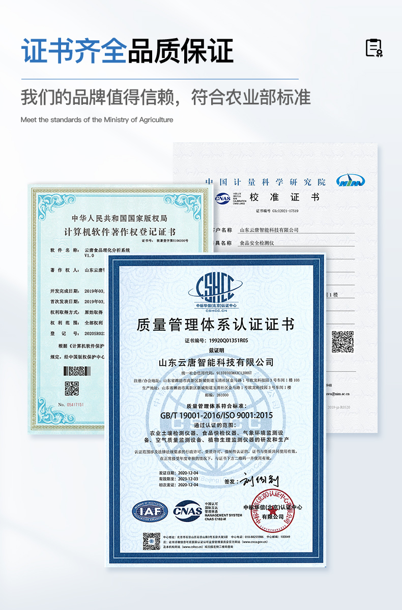 | 安卓智能操作系統(tǒng),采用更加**和人性化操作,儀器具有網(wǎng)線連接、wifi聯(lián)網(wǎng)上傳、GPRS無線遠(yuǎn)傳功能,快速上傳數(shù)據(jù)。 | 智能化程度高,儀器具有自檢功能:具有開機(jī)自檢和調(diào)零功能,具有自動檢測重復(fù)性功能。 | 檢測通道:3個(gè)檢測通道,可以同時(shí)測試多個(gè)樣品,每個(gè)樣品由程序控制分別獨(dú)立工作,不會互相干擾。 | 顯示方式:≥8英寸液晶觸摸屏顯示,人性化中文操作界面,讀數(shù)直觀、簡單。 | 配備新一代嵌入式熱敏打印機(jī),可選擇手動打印或者自動打印,檢測完成可自動打印檢測報(bào)告和二維碼。 | 光源采用進(jìn)口超高亮發(fā)光二極管,高精度、穩(wěn)定性強(qiáng)、光源可控、可以關(guān)掉不使用的光源,功耗更低。 | 采用USB2.0接口設(shè)計(jì),方便數(shù)據(jù)的存貯和移動,并可隨時(shí)與計(jì)算機(jī)直接相連,并且可用計(jì)算機(jī)控制儀器。實(shí)現(xiàn)數(shù)據(jù)查詢、瀏覽、分析、統(tǒng)計(jì)、打印等。 | 儀器帶有監(jiān)管平臺。數(shù)據(jù)可局域網(wǎng)和互聯(lián)網(wǎng)數(shù)據(jù)上傳,檢測結(jié)果直接傳至食品安全監(jiān)管平臺。進(jìn)行區(qū)域食品安全監(jiān)管及大數(shù)據(jù)分析處理,檢測區(qū)域食品安全長短期動態(tài),達(dá)到食品安全問題預(yù)估、預(yù)警 | 一體化便攜式快檢設(shè)備,滿足現(xiàn)場及流動檢測使用需求,能夠在同一軟件下實(shí)現(xiàn)所有檢測項(xiàng)目的檢測,并可通過同一窗口直觀顯示檢測結(jié)果。 | 儀器具有多品類多種類樣品菜單庫,可靈活選擇檢測樣品,不同的檢測通道可同時(shí)檢測不同的樣品項(xiàng)目。也可在儀器上直接編輯錄入樣品名稱、檢測指標(biāo)、送檢單位等信息并保存進(jìn)樣品數(shù)據(jù)庫。 | 樣品處理簡單省力,整體操作快速、安全、便捷。 | 儀器具有自身保護(hù)功能,可設(shè)置用戶名及密碼,防止非工作人員操作等。 | 高靈敏度,高檢測精度,高重復(fù)性精度,掃描式高精度光學(xué)傳感器。 | 儀器具有重新校準(zhǔn)、鎖定、恢復(fù)出廠設(shè)置功能。 | 支持U盤存儲。 結(jié)果判定線可修改,對照值標(biāo)定值可保存,斷電不丟失數(shù)據(jù)。 |