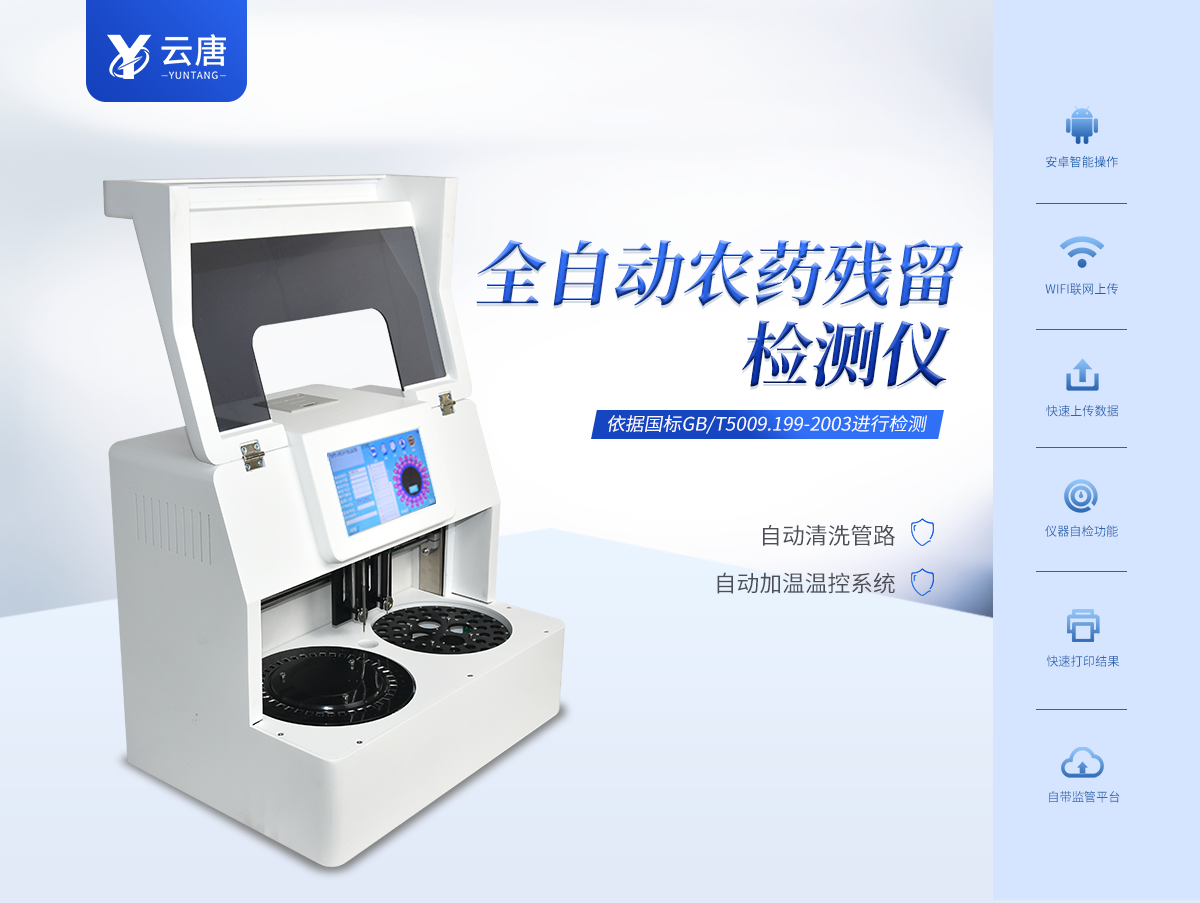 云唐全自動(dòng)農(nóng)藥殘留檢測儀YT-NY2000,檢測標(biāo)準(zhǔn):依據(jù)國家標(biāo)準(zhǔn)方法(GB/T5009.199-2003)以及世界衛(wèi)生組織WHO、世界糧農(nóng)組織FAO殘留農(nóng)藥檢測標(biāo)準(zhǔn)、世界環(huán)境保護(hù)局EPA參照攝入量等要求來設(shè)計(jì)。采用酶抑制率比色法對水果、蔬菜等農(nóng)林產(chǎn)品中有機(jī)磷和氨基甲酸酯類農(nóng)藥含量進(jìn)行快速準(zhǔn)確的檢測。