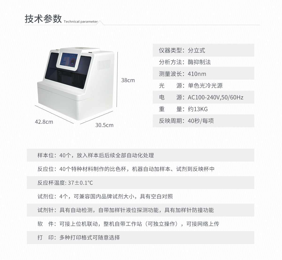 | 波長配置:   410 | 試 劑 針:   3根 | 檢測通道:   20個(gè) | 反應(yīng)溫度:   37℃,儀器具有自動(dòng)加溫溫控系統(tǒng) | 觸 摸 屏:   7寸觸摸屏,可單機(jī)操作 | 比 色 皿:   容量 0 - 4.5ml | 試 劑 盒:   配套試劑存放盒,可整體取出 | 清洗功能:   可自動(dòng)清洗試劑管路,避免試劑污染 | 加樣功能:   儀器按照試劑要求自動(dòng)、按時(shí)、按量加入試劑,提高工作效率 | 自動(dòng)混勻:   儀器測試過程中自動(dòng)震蕩混勻保證試劑充分反應(yīng) | 實(shí)時(shí)監(jiān)控:   儀器測試過程中顯示實(shí)時(shí)運(yùn)行狀態(tài) | 打印功能:   內(nèi)置熱敏打印機(jī),可快速打印檢測結(jié)果,方便數(shù)據(jù)留存 | 數(shù)據(jù)存儲(chǔ):   大容量存儲(chǔ)器,能存儲(chǔ)12萬條數(shù)據(jù) | 數(shù)據(jù)接口:   外接USB接口,網(wǎng)線接口 | 網(wǎng)絡(luò)連接:   可連接有線網(wǎng)絡(luò)和無線wifi | 上位機(jī)軟件:   儀器配套電腦端上位機(jī)軟件,可通過軟件進(jìn)行寫入?yún)?shù)及讀取數(shù)據(jù) | 樣本檢測:   儀器自動(dòng)對未正常放置的樣本或異常的樣本進(jìn)行檢查并報(bào)警提示 | 試劑檢測:   儀器測試前和測試過程中時(shí)刻對試劑進(jìn)行檢查,檢查試劑是否缺失,如有異常儀器會(huì)進(jìn)行報(bào)警提示,對已經(jīng)加入試劑的樣本進(jìn)行正常測試,不影響測試結(jié)果,對未測試的樣本停止測試。 | 數(shù)據(jù)上傳:   儀器數(shù)據(jù)可傳入電腦端,按照客戶需求進(jìn)行保存或打印 | 儀器重量:   約7KG | 儀器尺寸:   410mm*290mm*202mm |