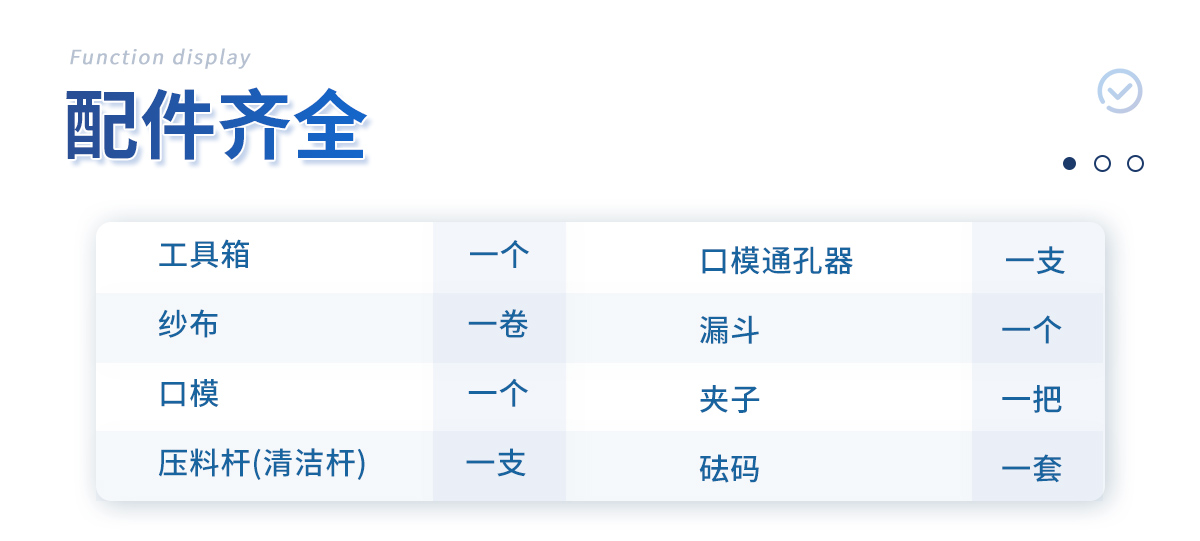 附件:工具箱一個,紗布一卷,口模一個,壓料桿(清潔桿)一支、口模通孔器一支.漏斗一個.夾子一把.砝碼一套.
