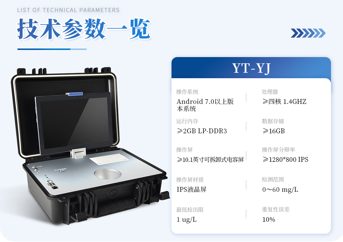 | 基本概述:便攜式箱體化一體機(jī),采用防水、抗壓、防撞擊、防腐蝕箱體設(shè)計(jì),滿足車載環(huán)境、無電源環(huán)境以及戶外檢測需求; | 主機(jī):具備檢測功能、輔助功能、管理系統(tǒng)軟件、信息化管理功能,信息化實(shí)現(xiàn)數(shù)據(jù)雙向傳輸,能直接接收管理中心下發(fā)任務(wù),并實(shí)時上報(bào)檢測結(jié)果至管理平臺; | 檢測技術(shù):采用陽極溶出伏安法檢測技術(shù); | 操作系統(tǒng):Android 7.0以上版本系統(tǒng); | 處理器:≥四核 1.4GHZ; | 運(yùn)行內(nèi)存:≥2GB LP-DDR3; | 數(shù)據(jù)存儲:≥16GB; | 通訊接口:包含兩個USB接口、網(wǎng)線接口、WIFI、藍(lán)牙、4G模塊,內(nèi)置GPS接口,用于戶外或者其他移動檢測定位; | 指示燈:具有熱敏打印機(jī)工作指示燈,用于提示打印機(jī)工作狀態(tài);具有電源充電指示燈,用于提示儀器充電狀態(tài);具有無線藍(lán)牙對接狀態(tài)提示燈,用于提示操作平臺與儀器主機(jī)連接狀態(tài);具有儀器工作狀態(tài)提示燈,用于提示儀器主機(jī)是否處于工作狀態(tài); | 操作屏:≥10.1英寸可拆卸式電容屏設(shè)計(jì),操作屏可以固定在儀器上,也可以取出單獨(dú)操作實(shí)現(xiàn)運(yùn)程控制; | 操作屏分辯率:≥1280*800 IPS; | 操作屏材質(zhì): IPS液晶屏; | 輸入方式: 電容屏、觸摸輸入、支持多點(diǎn)觸控; | 采用無汞電極,安全無毒; | 模塊自帶攪拌功能,啟動后既可自動攪拌溶液。 | 檢測范圍: 0~60 mg/L ,**檢出限:1 ug/L; | 重復(fù)性誤差: 10%; | 具有自動尋峰功能,計(jì)算出樣品**數(shù)據(jù); | 內(nèi)置線性掃描、常規(guī)脈沖掃描、微分脈沖掃描; | 儀器現(xiàn)場取證功能: 儀器具有800萬以上防抖、自動對焦高清攝像頭,對檢測實(shí)樣進(jìn)行現(xiàn)場拍照取證; | 電源控制器: 雙電源控制器,節(jié)省電量; | 運(yùn)程控制:支持20米內(nèi)無線藍(lán)牙控制儀器檢測,方便使用者沒在儀器身邊時也能完成項(xiàng)目檢測; | 打印: 內(nèi)置微型熱敏打印機(jī),可隨時打印檢測結(jié)果; | 電池:內(nèi)置大容量可充電鋰電池,可連續(xù)工作5小時以上; | 箱體: 便攜一體化手提箱,箱體能防水,抗壓,整機(jī)重量小于5kg,攜帶方便; |
