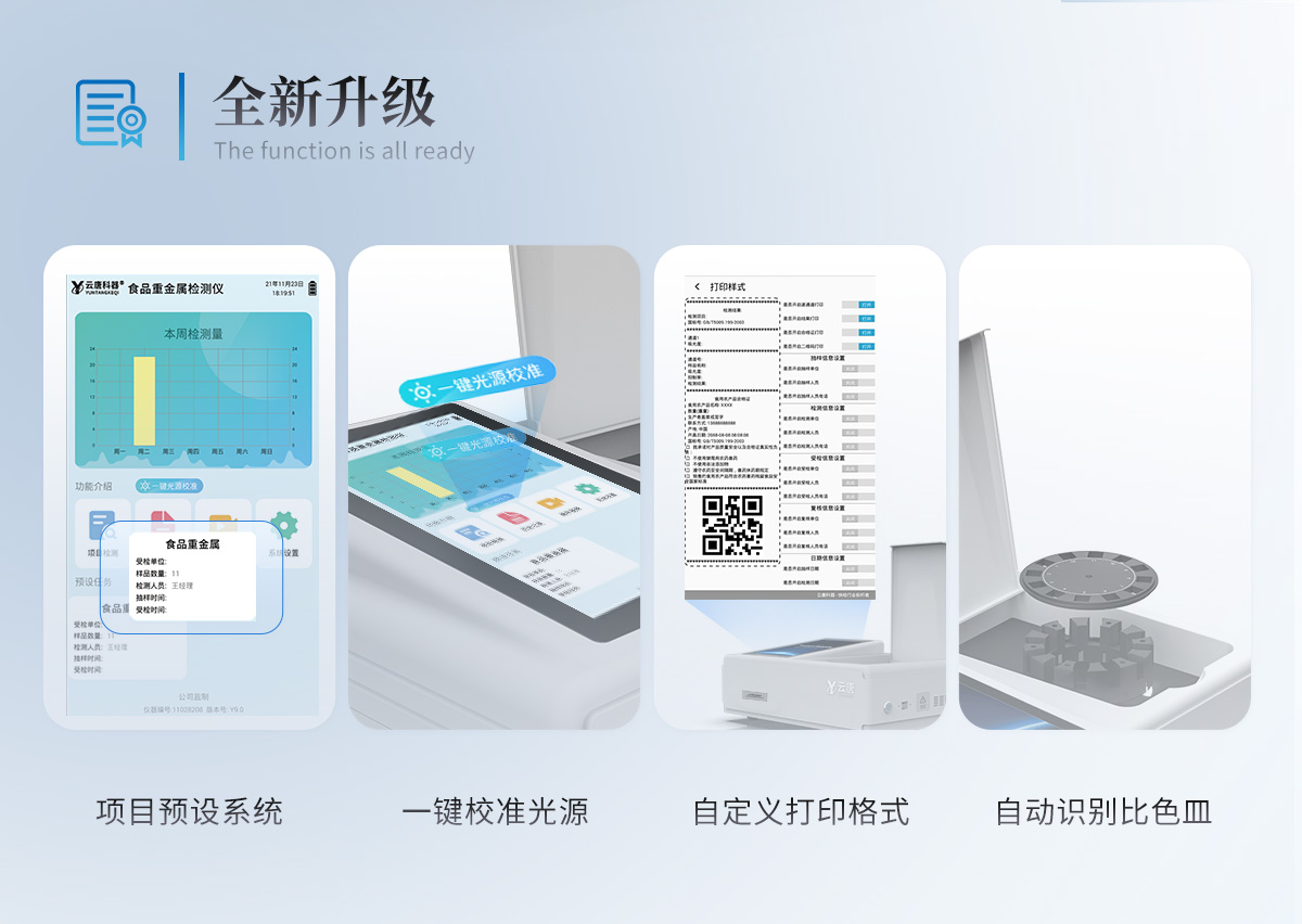 | 儀器采用臺式一體化系統(tǒng)檢測技術(shù),將分光光度模塊、新型農(nóng)殘檢測模塊、數(shù)字化管理模塊、無線通訊模塊高度集成于一體,支持檢測200種食品安全檢測項目,同時預留升級檢測方法。 | 儀器檢測模塊標準化、智能化,可隨意自由組合。檢測箱體內(nèi)置多個標準檢測單元,檢測模塊可以調(diào)整配置。 | 儀器采用全新安卓智能系統(tǒng),主控芯片采用 ARM Cortex-A7,RK3288/4核處理器,10.1寸高清液晶觸摸豎屏,更加**的UI交互界面,運轉(zhuǎn)快捷;儀器配備無線通信模塊: 4G(APN)通訊模塊、Wifi模塊,藍牙傳輸,同時具有雙USB接口以及RJ45接口能以多種方式實現(xiàn)數(shù)據(jù)保存和數(shù)據(jù)傳輸功能。 | 創(chuàng)新檢測模式: | ★檢測通道:≥12通道;采用精密旋轉(zhuǎn)比色池設計,使用同芯片同光源校準精度,解決不同光源之間的誤差值。1-12通道間誤差0.1%。(***:**202022821055.2) | ★儀器具有自動識別比色皿檢測功能,即:將樣品比色皿放入儀器后,點擊樣品檢測,儀器自動識別比色皿進行通道檢測。 | 進口高精光源: | 高精度進口四波長冷光源,通道配置 410、520、590、630nm 波長光源,一個光源芯片驅(qū)動一個光源,誤差極小,每臺設備單獨**校準光源,**比對,同時參照四種不同波段光源全方位覆蓋市面上99%的農(nóng)殘食品項目檢測。 | 智能化操作系統(tǒng): | 便捷操作系統(tǒng):設備檢測時可在同一檢測界面自動對應相關(guān)檢測通道一次性選擇1-12個樣品名稱,無須退出界面,節(jié)省操作時間。 | 數(shù)據(jù)集成系統(tǒng):設備首頁自動統(tǒng)計檢測數(shù)據(jù)包含:周檢測數(shù)據(jù)、月檢測數(shù)據(jù),全部檢測總數(shù)量,均包含檢測總數(shù),合格數(shù),不合格數(shù),以及相關(guān)柱形分析圖,對各項檢測數(shù)據(jù)清晰掌握,無需電腦查詢,更加快捷直觀。 | 項目預設系統(tǒng):支持添加單個及多個相同或不相同的任務預設,一鍵快速調(diào)取,每一個任務分別可以設置不同的樣品、批次、編號、來源、備注、抽樣信息、檢測信息、受檢信息、復核信息等更多信息。無縫鏈接平臺和APP實時查看下發(fā)任務。 | 數(shù)據(jù)監(jiān)管系統(tǒng):同步對接監(jiān)管平臺,數(shù)據(jù)可局域網(wǎng)和互聯(lián)網(wǎng)數(shù)據(jù)上傳,檢測結(jié)果可選擇直接傳至食品安全監(jiān)管平臺。集成OSS輸出存儲服務、區(qū)分設備定向管理應用,進行區(qū)域食品安全監(jiān)管及大數(shù)據(jù)分析處理與數(shù)據(jù)統(tǒng)計,檢測區(qū)域食品安全長短期動態(tài),達到食品安全問題預估、預警。 | 自定義打印系統(tǒng):內(nèi)置全新打印系統(tǒng),新創(chuàng)自定義打印方式,可按需靈活設置開啟或關(guān)閉:產(chǎn)品合格證(國家農(nóng)業(yè)部標準要求),二維碼,抽樣信息、檢測信息,受檢信息、復核信息、抽樣日期、檢測日期等信息的打印。 | 系統(tǒng)遠程更新功能:可定向分客戶分儀器更新系統(tǒng),按照不同客戶后期實際需求添加項目,無需機器返廠,即可遠程實時升級全新系統(tǒng),節(jié)省時間成本及避免運輸造成設備損壞。 | 儀器主機采用一體化防水、抗壓、防撞擊、防腐蝕箱體設計,同時配備交直流供電,可連接車載電源,可選配大容量充電鋰電池,滿足現(xiàn)場野外檢測需求。 | 安全證書,放心保障:儀器具有中國計量科學研究院校準證書,權(quán)威認證。 |