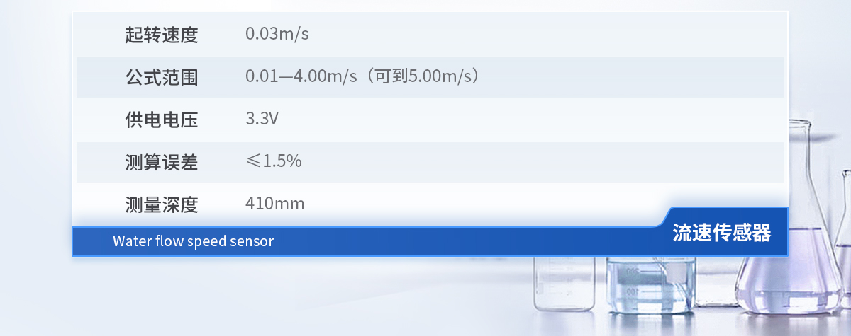 | 起轉速度 :0.03m/s | 公式范圍 :0.01—4.00m/s(可到5.00m/s) | 供電電壓:3.3V | 測算誤差 :≤1.5% | 測量深度 :410mm |