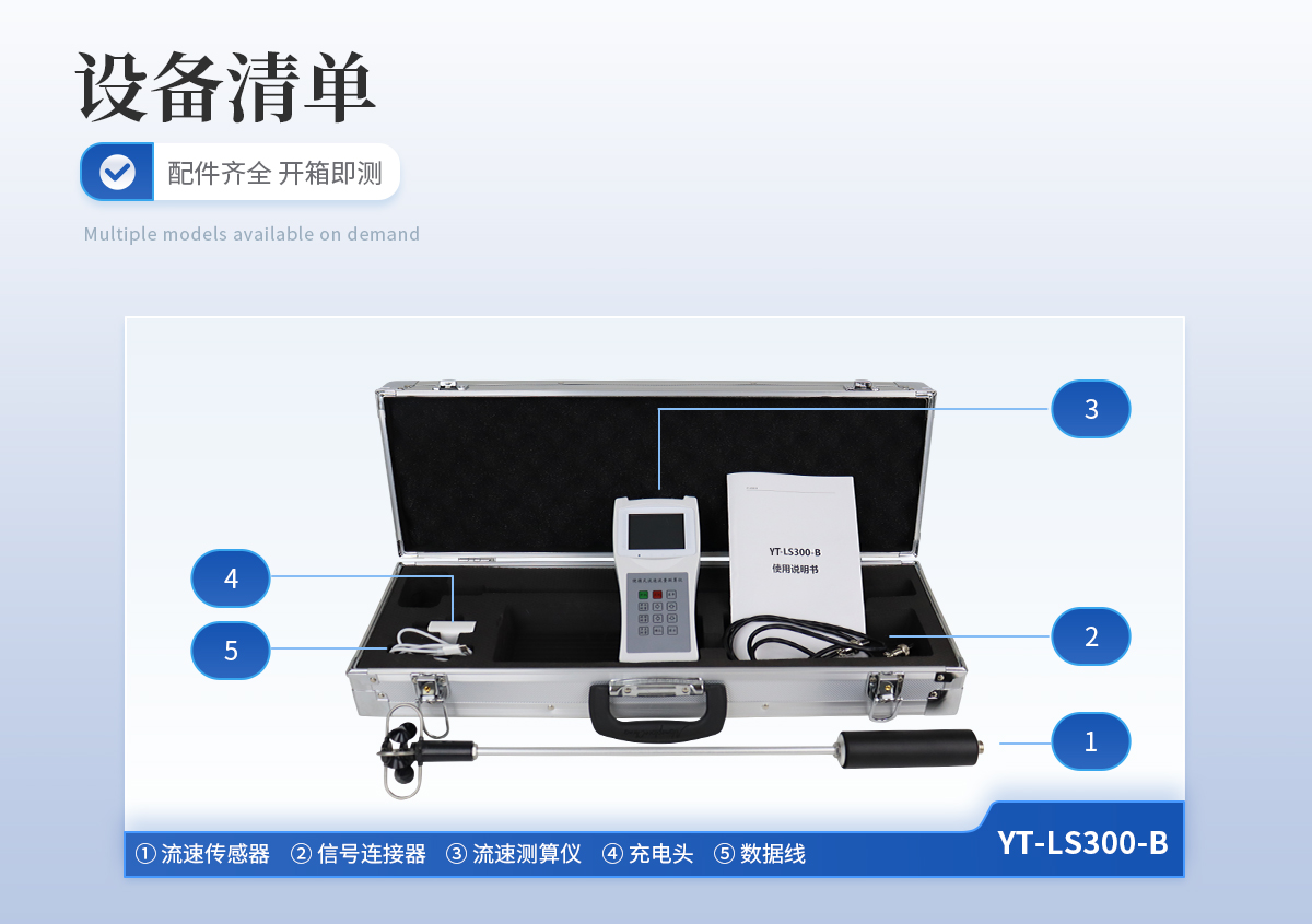 | ①流速傳感器、②信號連接器、③流速測算儀、④充電頭、⑤數據線 |