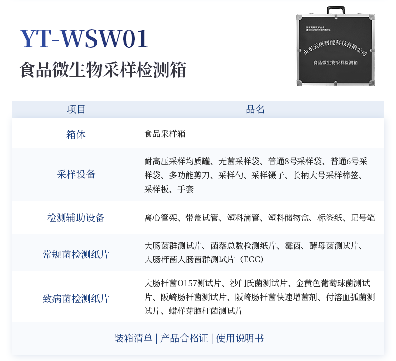 水產品安全快速檢測箱 序號 適用范圍 檢測項目 規格 單位 數量 檢測限 檢測范圍 1 果蔬、肉制品類 農藥殘留速測卡 20次 盒 5 0.3-3.5mg/kg / 亞硝酸鹽速測試紙 20條 套 1 2mg/kg 0-40mg/kg 硝酸鹽速測管 20次 盒 1 0.5mg/kg 0.5-10mg/kg(以N計) 瘦肉精三聯卡(組織) 各10次 包 1 鹽酸克倫克羅、萊克多巴胺3ppb,沙丁胺醇5ppb / 注水肉檢測試紙 50條 袋 1 定性 / 2 乳品類 三聚氰胺檢測卡 10條 包 1 100ppb / 乳品蛋白質含量速測盒 25次 盒 1 牛乳:1% 奶粉:5% 牛乳0-5%; 乳粉0-25% 3 豆制品 豆漿生熟度速測盒 50次 盒 1 定性 / 4 水發產品 甲醛檢測試紙 20條 套 1 10mg/kg / 雙氧水速測試紙 20條 套 1 5mg/kg 0-30mg/kg 水發食品中工業堿速測試紙 20條 套 1 0.4g/L / 5 糧食、堅果 硼酸和硼砂速測盒 100次 盒 1 25mg/kg 定性 吊白塊半定量速測盒 100次 盒 1 2.5mg/kg 0-100mg/L 大米新陳度檢測噴劑 50次 盒 1 定性 / 大米中石蠟/礦物油速測盒 100次 盒 1 1.00% / 黃曲霉毒素B1檢測卡 10次 包 1 0.5ppb / 6 食用油類 食用油酸價速測盒 100次 盒 1 1mg/kg 0-8mg/kg 食用油過氧化值速測盒 100次 盒 1 0.09g/100g 0.09-0.45g/100g 7 調味品 食醋總酸速測盒 20次 盒 1 0.26g/100mL / 工業乙酸速測盒 100次 盒 1 定性 / 食醋游離礦酸速測試紙(淺色醋) 20條 套 1 0.50% / 食醋游離礦酸速測試紙(深色醋) 20條 套 1 0.50% / 食鹽含碘量速測試紙 20條 套 1 15mg/kg 0-40mg/kg 味精谷氨酸鈉速測盒 15次 盒 1 2.60% / 醬油總酸與氨基酸態氮速測盒 20次 盒 1 總酸: 0.45g/100mL氨基酸態氮:0.078g/100mL / 8 腐竹、粉絲、蜜餞等 二氧化硫檢測試紙 20條 套 1 15mg/kg 0-150mg/kg 9 其他 雞蛋新鮮度速測盒 10次 盒 1 定性 / 食品中心溫度計(可測油溫) -50~300℃ 支 1 / / 10 箱體預裝輔助設備 食品安全快速檢測箱I 便攜式 個 1 / / 便攜水浴鍋 功率300W 個 1 多功能剪刀 - 把 1 計算器 - 個 1 洗瓶 250ml 個 1 塑料滴管 3ml 根 10 塑料滴管 0.2ml 根 50 樣品管架 10ml 個 1 天平 0.1-200g 個 1 移液器 1mL 支 1 玻璃三角瓶 100ml 個 2 玻璃樣品管 10ml 個 2 小離心管 1.5ml 個 24 塑料樣品管 10ml 個 10 樣品瓶 50ml 個 2 離心管架 1.5ml 個 1 燒杯 250ml 個 1 量筒 100ml 個 1 手套 - 包 1 計時器 - 個 1 槍頭 1ml 個 20 組織提取器 便攜式 個 1 錫箔紙 10張/包 包 1 裝箱清單 - 份 1 產品合格證 - 份 1 使用說明書 - 份 1 |