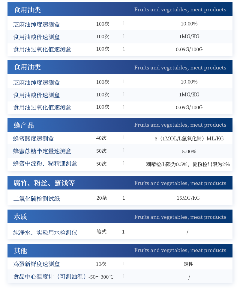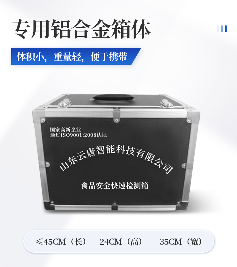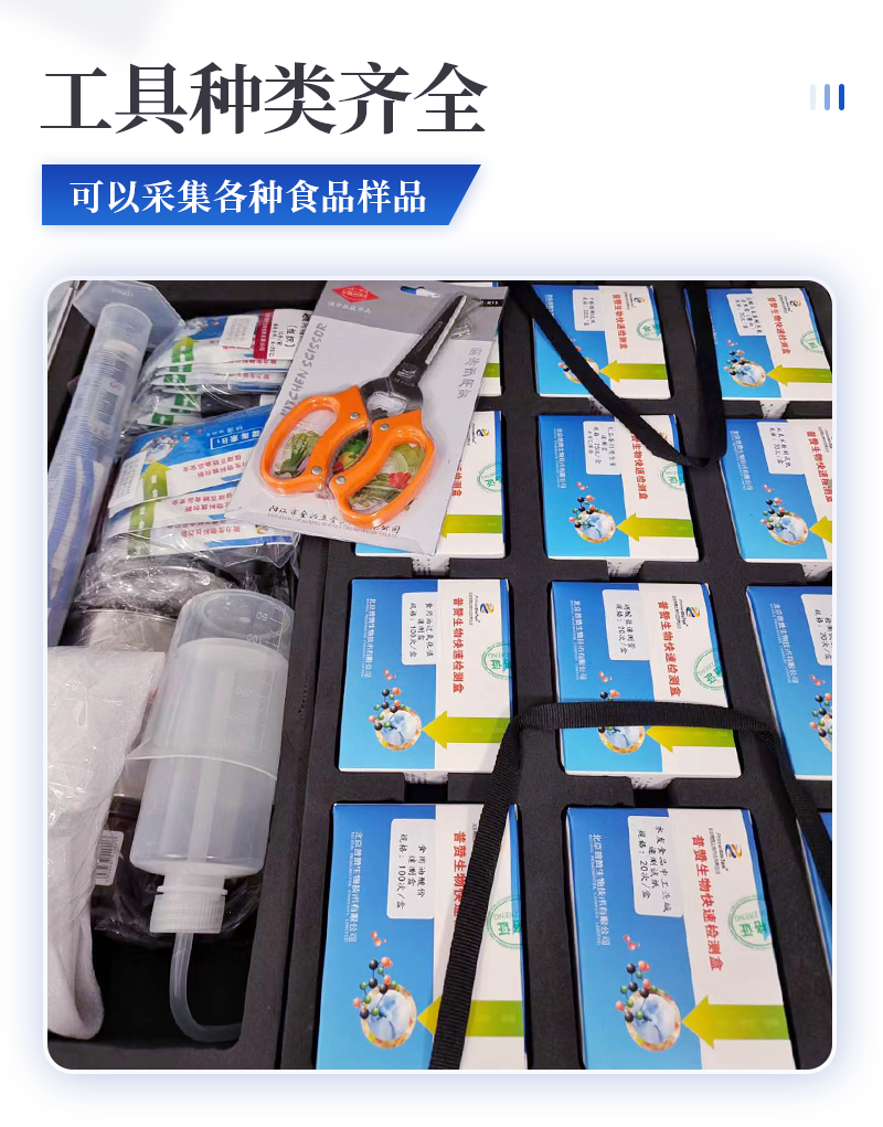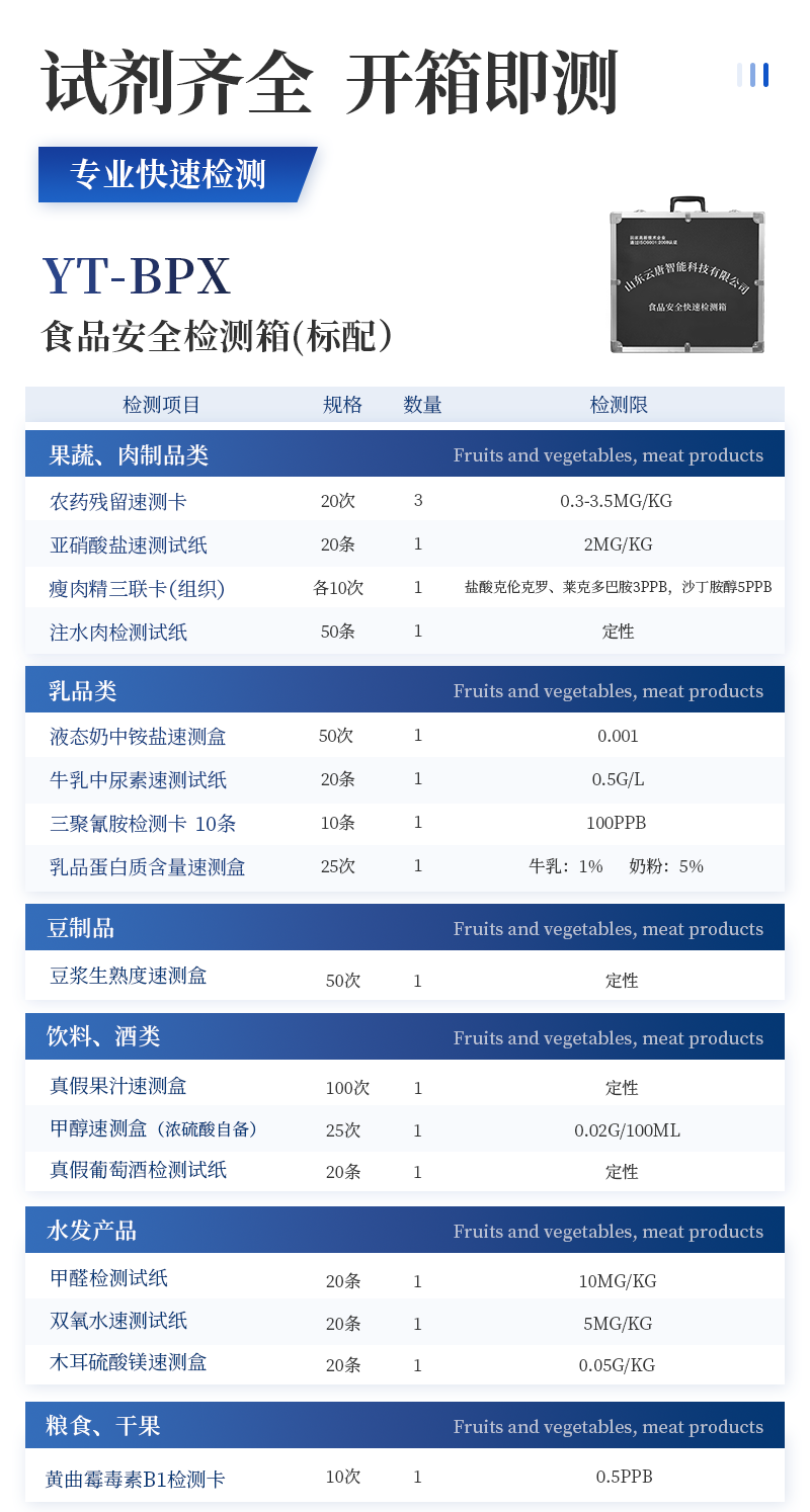 急性中毒快速檢測箱標配箱 序號 適用范圍 檢測項目 規格 單位 數量 檢測限 檢測范圍 1 果蔬、肉制品類 便攜式農藥殘留快速檢測儀 12通道 臺 1 / / 農藥殘留速測卡 20次 盒 3 0.3-3.5mg/kg / 亞硝酸鹽速測試紙 20條 套 1 2mg/kg 0-40mg/kg 砷速測盒 30次 盒 1 砷:2mg/kg / 汞速測盒 30次 盒 1 汞:20mg/kg / 瘦肉精三聯卡(組織) 各10次 包 2 鹽酸克倫克羅、萊克多巴胺3ppb,沙丁胺醇5ppb / 2 豆制品 奶制品 液態奶新鮮度速測盒 20次 盒 1 0.60T / 豆漿生熟度速測盒 50次 盒 1 定性 / 3 飲料、酒類 甲醇速測盒(濃硫酸自備) 25次 盒 1 0.02g/100mL 0-0.32g/100mL 4 糧食、干果 黃曲霉毒素B1檢測卡 10次 包 1 0.5ppb / 5 食用油類 食用油酸價速測盒 100次 盒 1 1mg/kg 0-8mg/kg 食用油過氧化值速測盒 100次 盒 1 0.09g/100g 0.09-0.45g/100g 6 食物及水 中毒物殘留 毒鼠強速測盒(乙酸乙酯自備) 10次 盒 1 2mg/kg / 敵鼠鈉鹽速測盒 100次 盒 1 100mg/kg / 氰化物檢測試紙 20條 套 1 1mg/L 0-10mg/L 氟乙酰胺速測盒 30次 盒 1 50mg/kg / 硼酸和硼砂速測盒 100次 盒 1 25mg/kg 定性 鼠藥安妥檢測試紙 40次 包 1 0.02mg/g,mL / 鼠藥磷化鋅速測盒 10次 包 1 20mg/kg / 7 箱體預裝輔助設備 急性中毒箱箱體 便攜式 個 1 / / 便攜水浴鍋 功率300W 個 1 多功能剪刀 - 把 1 計算器 - 個 1 洗瓶 250ml 個 1 塑料滴管 3ml 根 10 塑料滴管 0.2ml 根 50 樣品管架 10ml 個 1 天平 0.1-200g 個 1 移液器 1mL 支 1 玻璃三角瓶 100ml 個 2 玻璃樣品管 10ml 個 2 小離心管 1.5ml 個 24 塑料樣品管 10ml 個 10 樣品瓶 50ml 個 2 離心管架 1.5ml 個 1 燒杯 250ml 個 1 量筒 100ml 個 1 手套 - 包 1 計時器 - 個 1 槍頭 1ml 個 20 組織提取器 便攜式 個 1 錫箔紙 10張/包 包 1 裝箱清單 - 份 1 產品合格證 - 份 1 使用說明書 - 份 1 |