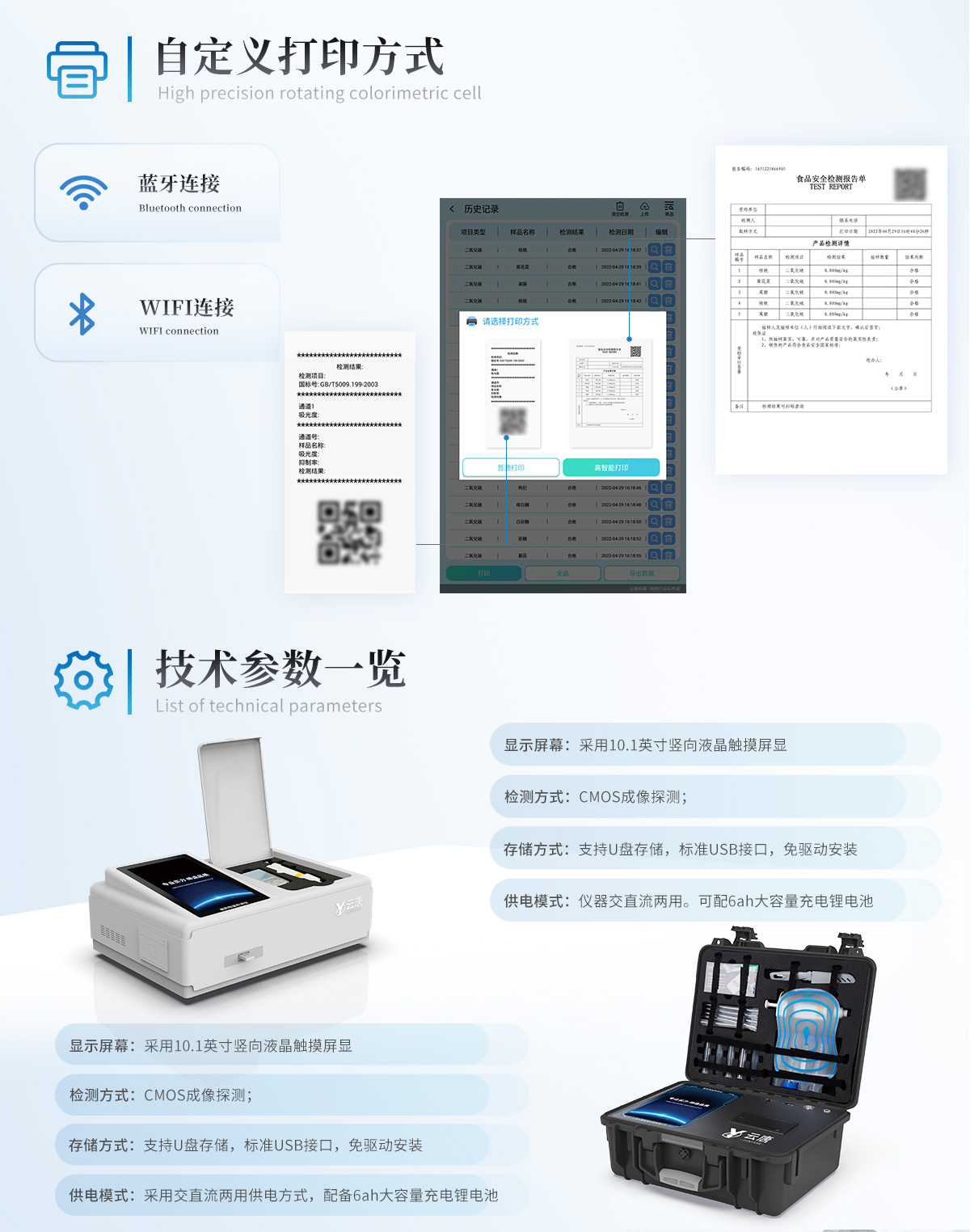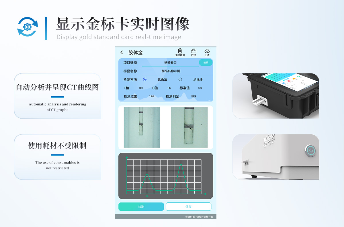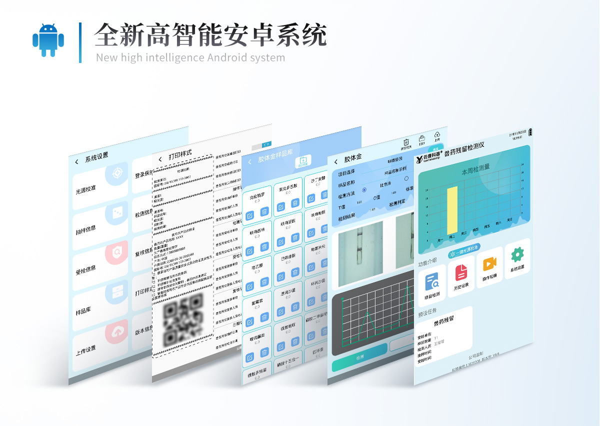 | 1、儀器采用10.1英寸液晶觸摸屏顯,搭配運行安卓智能操作系統,主控芯片采用ARM Cortex-A7,RK3288/4核處理器,主頻1.88Ghz,運轉速度更快速,性能更強。 | 2、儀器功能包括:膠體金檢測模塊、數字化管理模塊、無線通訊模塊等,可以滿足同一軟件下實現所有檢測項目的檢測,并在同一窗口展示檢測結果。 | 3.一體化臺式快檢設備,采用交直流兩用供電方式,可連接車載電源,配備6ah大容量充電鋰電池,可以滿足現場及流動檢測使用的需求。儀器尺寸:43×35×20cm, 主機凈重:5.1kg | 4、系統自帶數據集成模塊,設備首頁自動統計檢測數據包含:周檢測數據、月檢測數據,全部檢測總數量,均包含檢測總數,合格數,不合格數,以及相關柱形分析圖,對各項檢測數據清晰掌握,無需電腦查詢,更加快捷直觀。 | 5、儀器具有任務預設模塊,可在樣品送檢前提前預設樣品名稱、檢測指標、送檢單位等信息,樣品送檢時一鍵調取保存信息,檢測更加方便快捷。 | 6、膠體金檢測模塊: | 直插式自動掃描方式,可實時顯示金標卡實時圖像,系統自動分析并呈現出CT曲線圖,CT線自動識別,無需手動調整,完成檢測后自動退出檢測卡。 | 結果判定線可修改,對照值標定值可保存,斷電不丟失數據。 | 兼容市場上其他膠體金卡,使用耗材不受限制,極大增強用戶使用體驗。 | 7、儀器檢測系統擁有龐大數據庫,并且構建了完善的檢索、修訂功能。食品庫涵蓋多種樣品名稱,可按需添加或刪除、編輯樣品名稱;產品數據庫以及歷史檢測記錄支持一鍵檢索功能。 | 8、系統打印自定義化,打印格式多樣化,產品合格證(國家標準要求),二維碼,抽樣信息、檢測信息,受檢信息、復核信息、抽樣日期、檢測日期等信息結果,可按需求自行設置打印內容。 | 9、A4紙版本報告打印功能(可選配):設備擁有兩種結果展示方式,可以自動生成A4打印模板和小票打印模板兩種樣式,可通過WiFi及網線等方式鏈接外置打印機可進行打印 | 10、儀器具有 wifi 聯網上傳、RJ45網線連接功能,可以快速上傳數據。同步對接監管平臺,數據可局域網和互聯網數據上傳,檢測結果直接傳至食品安全監管平臺。進行區域食品安全監管及大數據分析處理與數據統計,檢測區域食品安全長短期動態,達到食品安全問題預估、預警。 | 11、設備支持U盤存儲,標準USB接口,免驅動安裝。檢測結果存儲容量20萬條以上,可生成Excel表格,進行一鍵拷貝,并具有登錄保護功能,可設置用戶名及密碼,規范不同人員操作權限,防止非工作人員操作,并且可以進行重新校準、鎖定、恢復出廠設置功能。儀器固件可升級,后期檢測項目可擴充。 | 12、儀器具備遠程升級功能,可定向分客戶分儀器更新,開機后自動更新,并可持續性免費更新系統版本,無需像傳統產品返廠更新,節省時間及人力成本并避免了物流運輸返廠升級導致設備損壞的潛在風險。 |