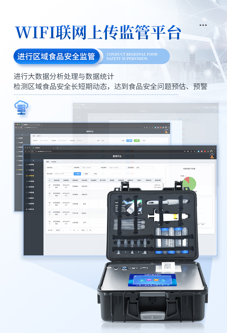 ★4、儀器帶有監管平臺,數據可局域網和互聯網數據上傳,檢測結果直接傳至食品安全監管平臺。進行區域食品安全監管及大數據分析處理與數據統計,檢測區域食品安全長短期動態,達到食品安全問題預估、預警