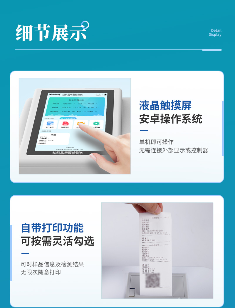 該紡織品甲醛檢測系統與質檢、商檢機構采用同樣執行標準、檢測方法,專業為廣大紡織品、服裝等生產企業、質檢商檢單位提供“一站式服務”,同時為各類紡織品甲醛實驗室提供專業的解決方案。