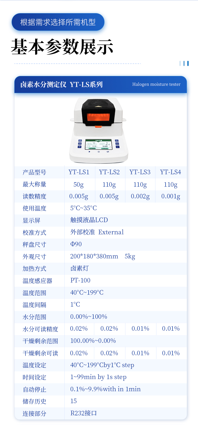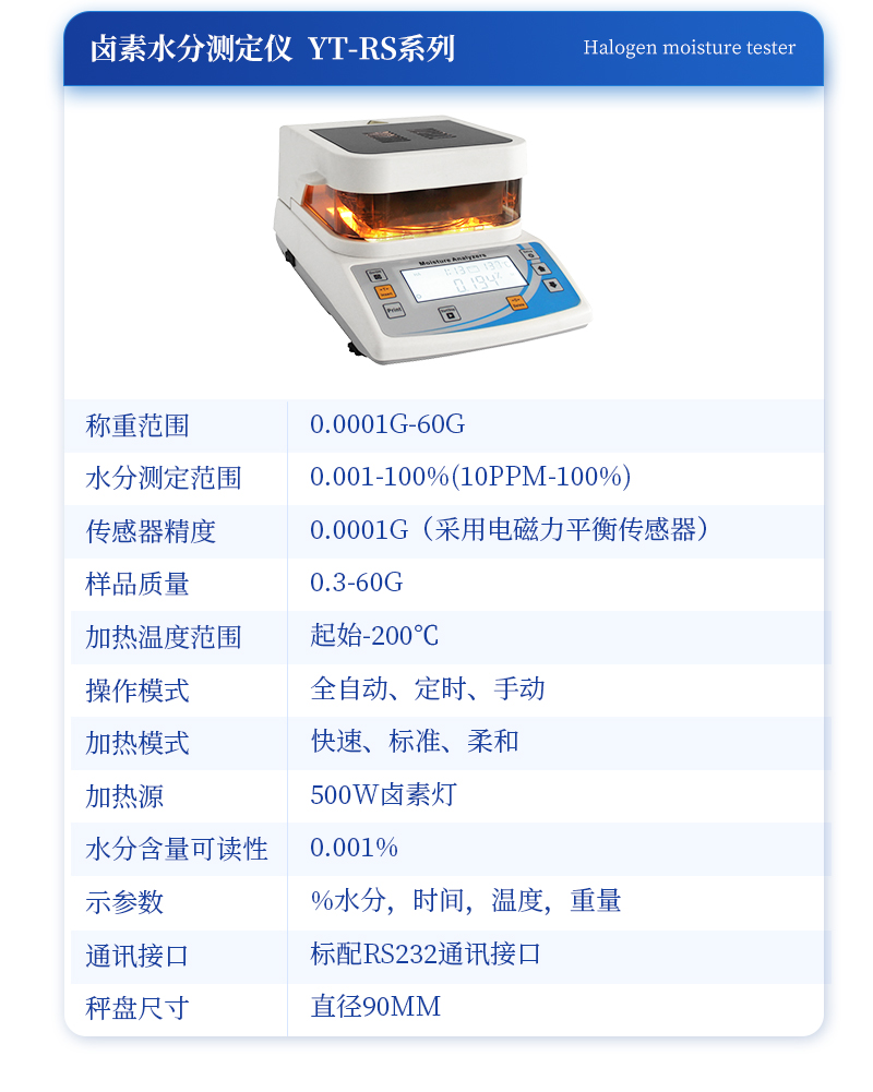 | 型號(hào) :YT-RS120A,**稱量值:120g ,顯示分度值:0.001g,可 讀 性 :0.01% | 型號(hào) : YT-RS120B,**稱量值:120g ,顯示分度值: 0.002g ,可 讀 性 :0.01% | 型號(hào) : YT-RS50A,**稱量值:120g ,顯示分度值: 0.005g ,可 讀 性 :0.01% | 型號(hào) : YT-RS60A,**稱量值:120g ,顯示分度值: 0.01g ,可 讀 性 :0.1% | 加 熱 源 鹵素?zé)? 溫度設(shè)置 室溫- 180℃ | 數(shù)據(jù)保存 16組 重量校準(zhǔn) 100g | 稱盤(pán)尺寸 φ110 (mm) | 外形尺寸 (D*W*H)330*205*165(mm) | 包裝尺寸 (D*W*H)410*315*335 (mm) | 凈 重 3.2kg 毛 重 4.6kg |