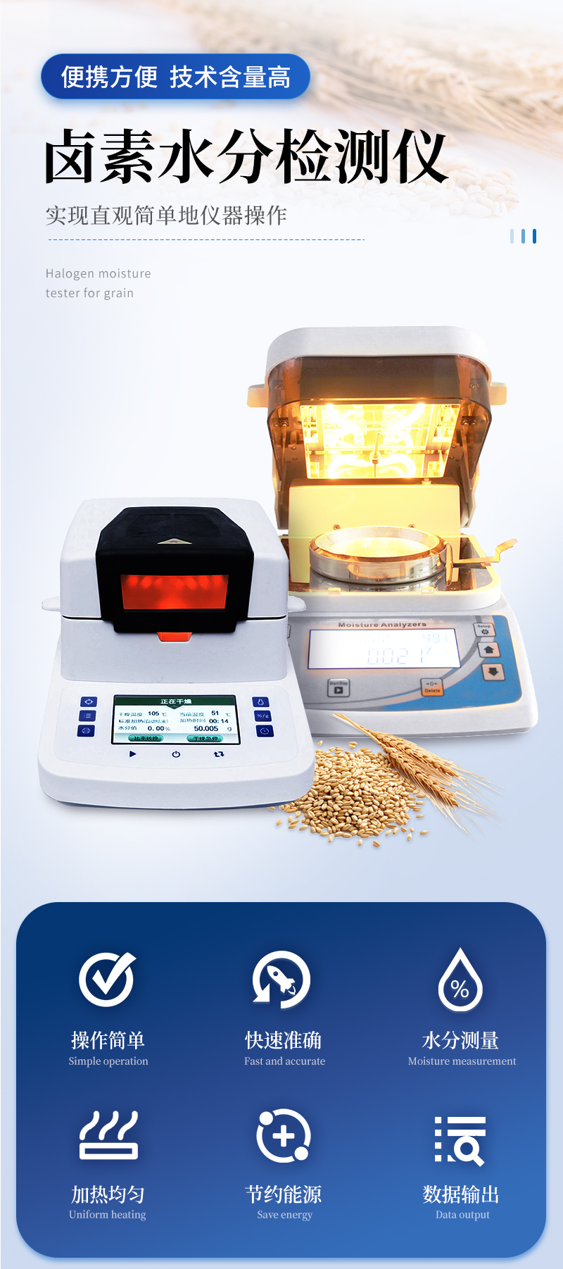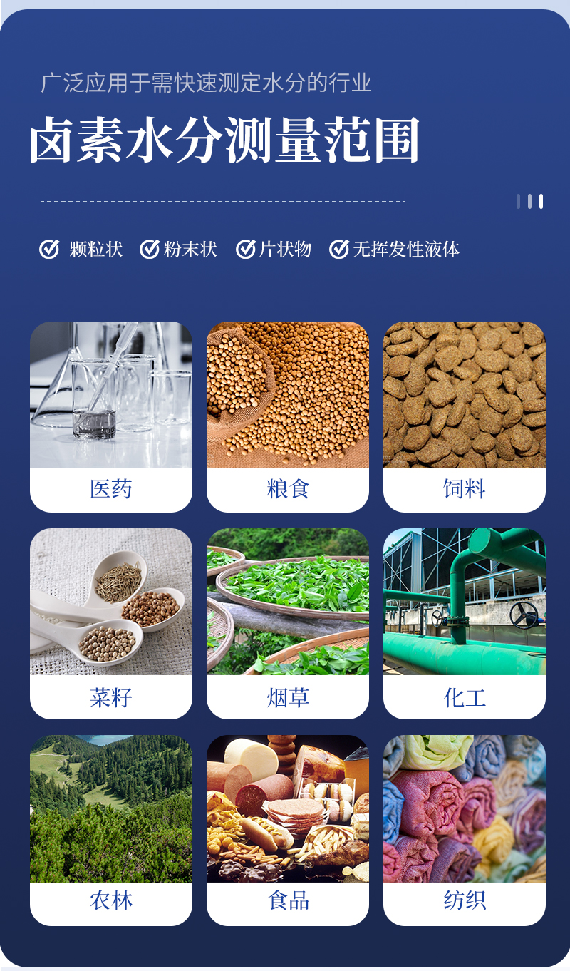 鹵素水分儀用于如:醫(yī)藥、塑膠、化工、食品、糧食、飼料、鈣鎂、質(zhì)量監(jiān)督檢驗(yàn)、等各行業(yè)中的生產(chǎn)過(guò)與實(shí)驗(yàn)過(guò)程中, 具有良好重現(xiàn)性的水分測(cè)定結(jié)果;清晰的按鍵和水分測(cè)定信息顯示,實(shí)現(xiàn)直觀簡(jiǎn)單地儀器操作;創(chuàng)新的預(yù)先存儲(chǔ)的16種不同樣品水分測(cè)定方法數(shù)據(jù)庫(kù),使得測(cè)試方法的開(kāi)發(fā)快速、簡(jiǎn)單