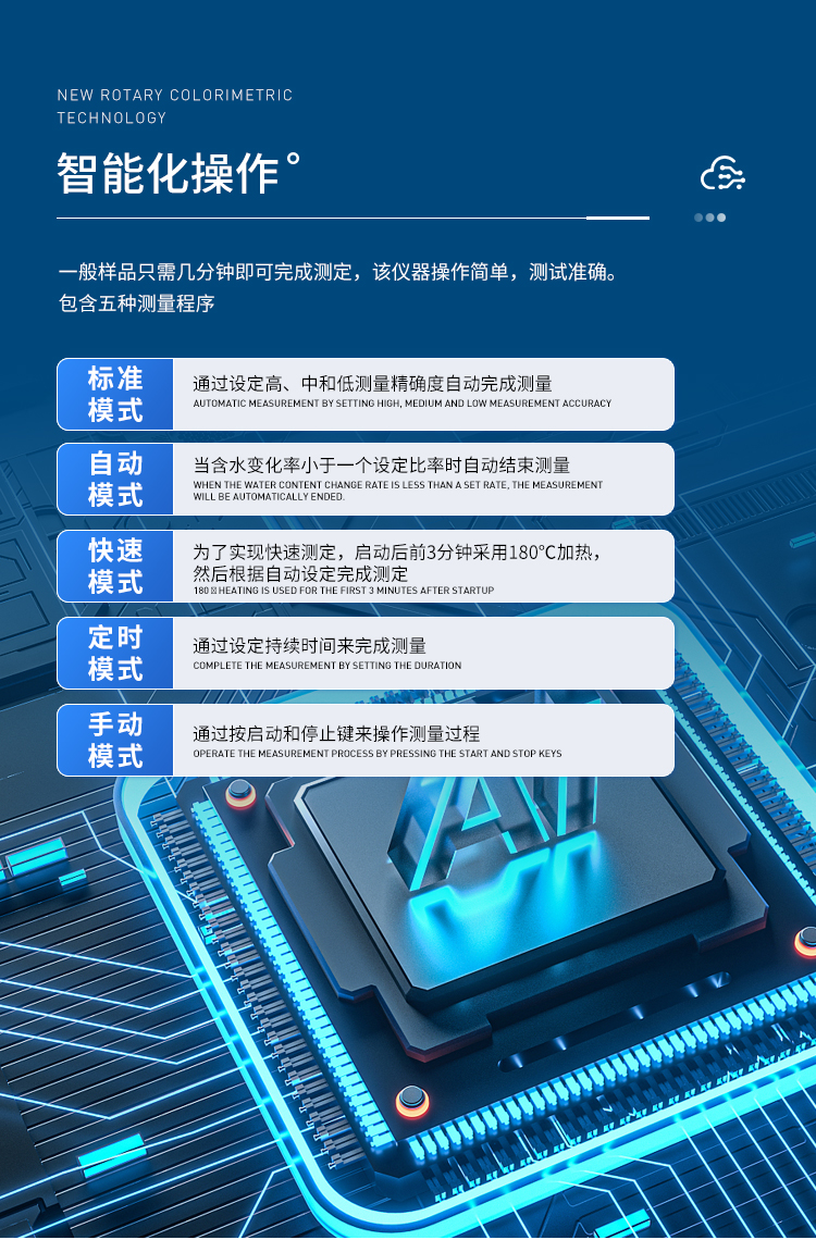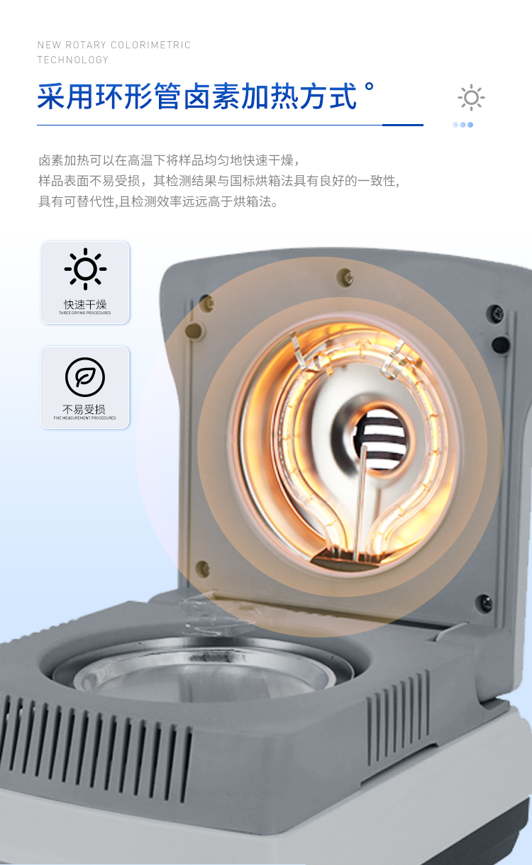 環狀的鹵素燈確保樣品得到均勻加熱,操作簡便、測量準確。鹵素水分測定儀在測量樣品重量的同時,儀器采用環形管鹵素加熱方式,快速干燥樣品,在干燥過程中,水分儀持續測量并即時顯示樣品丟失的水分含量%,干燥程序完成后,*終測定的水分含量值被鎖定顯示。與國際烘箱加熱法相比,鹵素加熱可以在高溫下將樣品均勻地快速干燥,樣品表面不易受損,其檢測結果與國標烘箱法具有良好的一致性,具有可替代性,且檢測效率遠遠高于烘箱法。智能化操作,一般樣品只需幾分鐘即可完成測定。該儀器操作簡單,測試準確,顯示部分采用液晶顯示屏-使屏幕更加清晰明亮,示值清晰可見,分別可顯示水分值,樣品初值,終值,測定時間,溫度初值,*終值等數據,并具有與計算機,打印機連接功能、符合GLP規范的打印數據輸出。