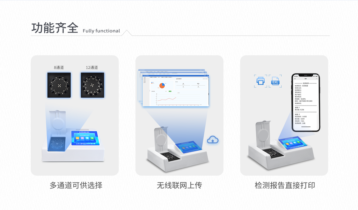 | 安卓智能操作系統,采用更加**和人性化操作,儀器具有無線聯網上傳功能,快速上傳數據,進行數據統計和分析。 | 智能化程度高,儀器具有自檢功能:具有開機自檢和調零功能,具有自動檢測重復性功能;同時,檢測完成可自動打印檢測報告和二維碼。手機掃碼可顯示出詳細檢測信息。 | 儀器帶有監管平臺,數據可局域網和互聯網數據上傳,檢測結果直接傳至食品安全監管平臺。進行區域食品安全監管及大數據分析處理與數據統計,檢測區域食品安全長短期動態,達到食品安全問題預估、預警 。 | 樣品處理簡單省力,整體操作快速、安全、便捷。 | 儀器具有自身保護功能,可設置用戶名及密碼,防止非工作人員操作等。 | 內置強大的數據庫,可在儀器上直接選擇樣品名稱、檢測指標、送檢單位等信息,也可在儀器上直接編輯錄入樣品名稱、檢測指標、送檢單位等信息并保存進樣品數據庫,方便后期操作調取使用。 | 儀器具有重新校準、鎖定、恢復出廠設置功能。 |