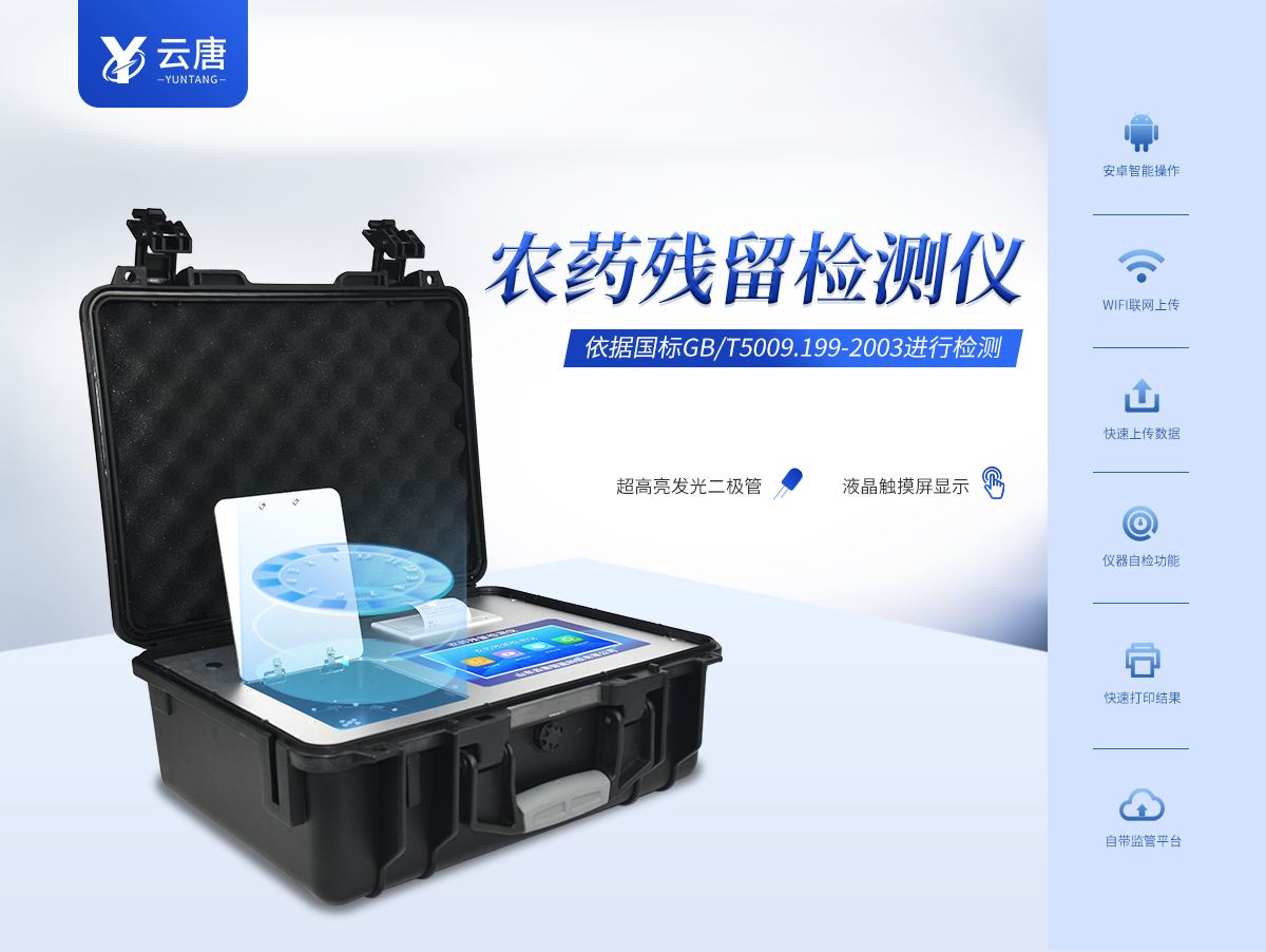 山東云唐智能科技有限公司生產的農藥殘留檢測儀廣泛應用于主要用于蔬菜、水果、茶葉、糧食、農副產品等食品中農藥殘留的快速檢測,依據國標GB/T5009.199-2003進行檢測,適用于果蔬茶生產基地以及農貿批發銷售市場現場檢測,餐館、學校、食堂、家庭果蔬加工前的安全速測等。