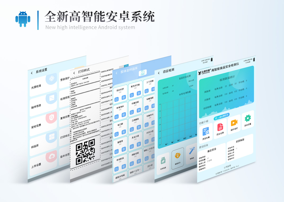 | 儀器采用臺式一體化系統(tǒng)檢測技術,將分光光度模塊、膠體金檢測模塊、新型農(nóng)殘檢測模塊、數(shù)字化管理模塊、無線通訊模塊高度集成于一體,支持檢測200種食品安全檢測項目,同時預留升級檢測方法。 | 儀器檢測模塊標準化、智能化,可隨意自由組合。檢測箱體內(nèi)置多個標準檢測單元,檢測模塊可以調(diào)整配置。 | 儀器采用全新安卓智能系統(tǒng),主控芯片采用 ARM Cortex-A7,RK3288/4核處理器,10.1寸高清液晶觸摸豎屏,更加**的UI交互界面,運轉快捷;儀器配備無線通信模塊: 4G(APN)通訊模塊、Wifi模塊,藍牙傳輸,同時具有雙USB接口以及RJ45接口能以多種方式實現(xiàn)數(shù)據(jù)保存和數(shù)據(jù)傳輸功能。 | 創(chuàng)新檢測模式★檢測通道:≥12通道;采用精密旋轉比色池設計,使用同芯片同光源校準精度,解決不同光源之間的誤差值。1-12通道間誤差0.1%。(***:**202022821055.2) ★儀器具有自動識別比色皿檢測功能,即:將樣品比色皿放入儀器后,點擊樣品檢測,儀器自動識別比色皿進行通道檢測。 | 進口高精光源:高精度進口四波長冷光源,通道配置 410、520、590、630nm 波長光源,一個光源芯片驅(qū)動一個光源,誤差極小,每臺設備單獨**校準光源,**比對,同時參照四種不同波段光源全方位覆蓋市面上99%的農(nóng)殘食品項目檢測。 | 膠體金模塊檢測方式:★采用COMS實時成像技術,可采集多個畫面,支持2個金標同時讀卡,通過不同顏色的灰度變化,一秒精準得出結果。 | 智能操作分析系統(tǒng): | ★便捷操作系統(tǒng):設備檢測時可在同一檢測界面自動對應相關檢測通道一次性選擇1-12個樣品名稱,無須退出界面,節(jié)省操作時間。(需提供對應證明) | ★數(shù)據(jù)集成系統(tǒng):設備首頁自動統(tǒng)計檢測數(shù)據(jù)包含:周檢測數(shù)據(jù)、月檢測數(shù)據(jù),全部檢測總數(shù)量,均包含檢測總數(shù),合格數(shù),不合格數(shù),以及相關柱形分析圖,對各項檢測數(shù)據(jù)清晰掌握,無需電腦查詢,更加快捷直觀。(需提供對應證明文件) | ★項目預設系統(tǒng):支持添加單個及多個相同或不相同的任務預設,一鍵快速調(diào)取,每一個任務分別可以設置不同的樣品、批次、編號、來源、備注、抽樣信息、檢測信息、受檢信息、復核信息等更多信息。無縫鏈接平臺和APP實時查看下發(fā)任務。(需提供對應證明文件) | ★數(shù)據(jù)監(jiān)管系統(tǒng):同步對接監(jiān)管平臺,數(shù)據(jù)可局域網(wǎng)和互聯(lián)網(wǎng)數(shù)據(jù)上傳,檢測結果可選擇直接傳至食品安全監(jiān)管平臺。集成OSS輸出存儲服務、區(qū)分設備定向管理應用,進行區(qū)域食品安全監(jiān)管及大數(shù)據(jù)分析處理與數(shù)據(jù)統(tǒng)計,檢測區(qū)域食品安全長短期動態(tài),達到食品安全問題預估、預警。(需提供對應食品理化分析系統(tǒng)計算機軟件著作權)。 | ★ 自定義打印系統(tǒng):內(nèi)置全新打印系統(tǒng),新創(chuàng)自定義打印方式,可按需靈活設置開啟或關閉:產(chǎn)品合格證(國家農(nóng)業(yè)部標準要求),二維碼,抽樣信息、檢測信息,受檢信息、復核信息、抽樣日期、檢測日期等信息的打印。(需提供對應證明) | ★系統(tǒng)遠程更新功能:可定向分客戶分儀器更新系統(tǒng),按照不同客戶后期實際需求添加項目,無需機器返廠,即可遠程實時升級全新系統(tǒng),節(jié)省時間成本及避免運輸造成設備損壞。 | 儀器主機采用一體化防水、抗壓、防撞擊、防腐蝕箱體設計,同時配備交直流供電,可連接車載電源,可選配大容量充電鋰電池,滿足現(xiàn)場野外檢測需求。 | 安全證書,放心保障:儀器具有中國計量科學研究院校準證書,權威認證。 |