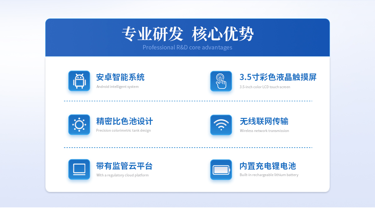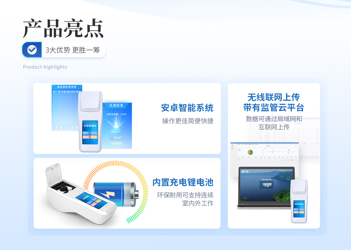 ①安卓智能系統,操作更佳簡便快捷;②配置云監控平臺,檢測結果可直接無線傳至平臺,進行水質長短期分析,輔助管理。③內置操作流程、操作簡單、無需培訓、直接上手;④檢測速度更快,現場讀取數據;⑥便攜式體積小,重量輕,方便戶外檢測;⑦外形小巧美觀,工作穩定免維護,具有較好的性價比;⑧采用進口冷光源,光學性能穩定,壽命長達10萬小時;⑨交直流兩用,內置充電鋰電池,環保耐用可支持連續室內外工作。