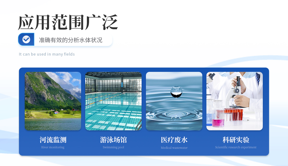 適用于飲用水、自來水、醫療廢水、工業污水、河流監測、游泳場館、水源保護、科研實驗等。