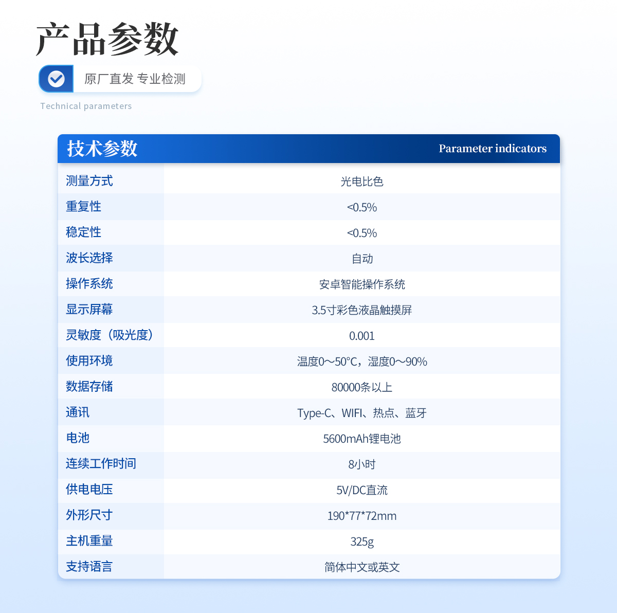 | 亞氯酸鹽:0.05~2.5mg/L; | 參考方法:碘量法原理 | 測量方式:光電比色 | 重復性:<0.5% | 穩定性:<0.5% | 波長選擇:自動 | 操作系統:安卓智能操作系統 | 顯示屏幕:3.5寸彩色液晶觸摸屏 | 靈敏度(吸光度):0.001 | 使用環境:溫度0~50℃,濕度0~90% | 數據存儲:80000條以上 | 通訊:Type-C、WIFI、熱點、藍牙 | 電池:5600mAh鋰電池 | 連續工作時間:8小時 | 供電電壓:5V/DC直流 | 尺寸:190mm*77mm*72mm | 主機重量:325g | 支持語言:簡體中文或英文 |