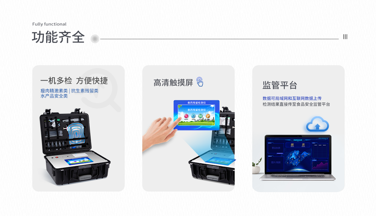 | 安卓智能操作系統,采用更加**UI交互界面,儀器具有wifi聯網上傳、4G聯網傳輸、GPRS無線遠傳、網線連接功能,快速批量上傳數據。 | 智能化程度高,儀器具有自檢功能:具有開機自檢和調零功能,具有自動檢測重復性功能。 | 新一代高速熱敏打印機,檢測完成可自動打印檢測報告和二維碼。 | 儀器帶有監管平臺,數據可局域網和互聯網數據上傳,檢測結果直接傳至食品安全監管平臺。進行區域食品安全監管及大數據分析處理與數據統計,檢測區域食品安全長短期動態,達到食品安全問題預估、預警 | 一體化主機,包含食品安全檢測模塊、多通道農藥殘留檢測模塊、膠體金免疫層析檢測模塊。 | 一體化便攜式快檢設備,滿足現場及流動檢測使用需求,能夠在同一軟件下實現所有檢測項目的檢測,并可通過同一窗口直觀顯示檢測結果。 | 膠體金模塊檢測方式:軌道式自動傳輸掃描,檢測完成后自動退出檢測卡。 | CT線自動識別,無需手動調整。 | 儀器具有品類多種類樣品菜單庫,可靈活選擇檢測樣品,不同的檢測通道可同時檢測不同的樣品項目。 | 樣品處理簡單省力,整體操作快速、安全、便捷。 | 儀器具有自身保護功能,可設置用戶名及密碼,防止非工作人員操作等。 | 高靈敏度,高檢測精度,高重復性精度,掃描式高精度光學傳感器。 | 內置強大的數據庫,可在儀器上直接選擇樣品名稱、檢測指標、送檢單位等信息,也可在儀器上直接編輯錄入樣品名稱、檢測指標、送檢單位等信息并保存進樣品數據庫。 | 儀器具有重新校準、鎖定、恢復出廠設置功能。 | 結果判定線可修改,對照值標定值可保存,斷電不丟失數據。 | 兼容市場上所有的膠體金卡,使用耗材不受限制,極大增強用戶使用體驗。 |
