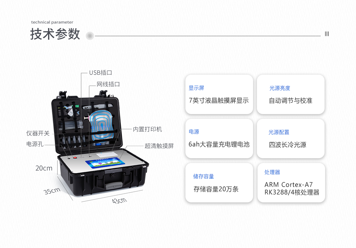| 主控芯片采用ARM Cortex-A7,RK3288/4核處理器,主頻1.88Ghz,運轉速度更快速,穩定性更強。 | 顯示方式:7英寸液晶觸摸屏顯示,人性化中文操作界面,讀數直觀、簡單。 | 交直流兩用,直流12V供電,可連接車載電源,可配6ah大容量充電鋰電池,方便戶外流動測試。 | 四波長冷光源,每個通道均配置410、520、590、630nm波長光源,標配**的光路切換裝置,專利光路切換功能可實現*多64波長,并且所有檢測項目可實現所有通道同時檢測。 | 光源亮度自動調節與校準 | 智能恒流穩壓,光強自動校準,長時間連續工作光源無溫漂現象。 | 內置新國家限量標準,與所測結果進行現場比對,并持續更新標準。 | 不間斷進樣,連續檢測 | 樣本編號自動累加。 | 數據無線上傳平臺,并可從平臺導出為Excel表格。 | 檢測結果存儲容量20萬條 | 同時支持U盤拷貝,標準USB接口,免驅動插拔。 | 檢測項目可擴充,固件可升級 | 儀器尺寸:43×35×20cm, 主機凈重:5.2kg |
