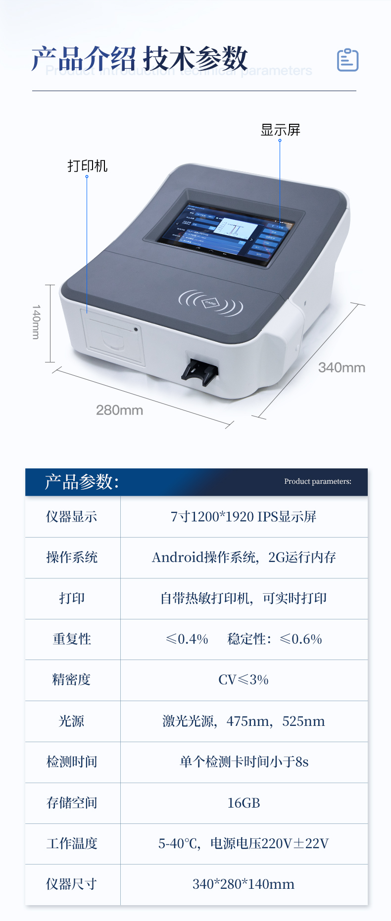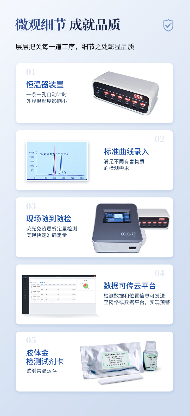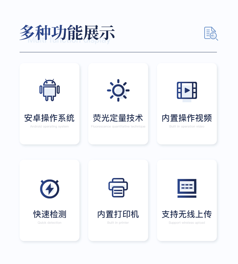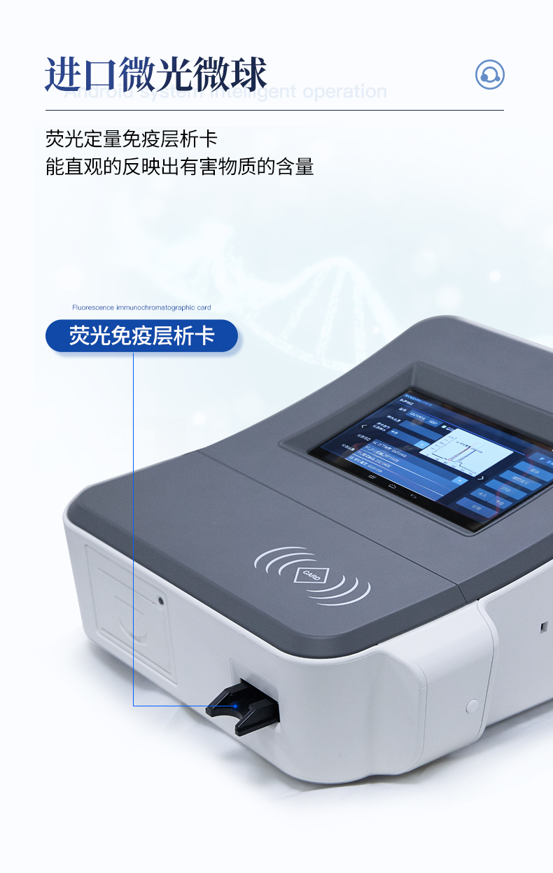 | 1、儀器自動識別檢測卡條形碼上的檢測項目、樣本類型、檢測限、標準曲線,形成完整的檢測數據信息鏈。一卡一控,插卡后儀器自動讀取檢測卡顯示的C、T線的熒光信號,依據檢測卡內置的標準曲線,自動計算結果;用戶可根據自身需求,選擇設定檢測限/定量限(內控或國家標準限量)。 | 2、檢測數據信息采集項目(包括但不限于):儀器至少支持以下檢測數據采集:①檢測項目;②樣本類型;③檢測樣本;④國家限量;⑤檢測者;⑥檢測單位;⑦檢測時間;⑧檢測線/定量限;⑨檢測編號;⑩內控限量 樣本來源等,并支持數據采集項目遠程擴展升級。 | 3、檢測數據采集方式:檢測數據信息采集項目中載明的:①-⑨項為儀器自動識別采集,⑩項為手寫輸入。 | 4、檢測數據上傳方式:完成檢測后,儀器能自動將檢測數據信息采集項目載明的全部檢測數據信息上傳至檢測監管系統平臺。 | 5、接口:藍牙通訊接口;內置無線WIFI,檢測數據實時傳輸到數據監管平臺,客戶可通過賬號登陸在網絡上實時查看檢測數據 | 6、存儲空間:存儲空間16GB。 | 7、信息輸入:支持中英文手寫輸入。 | 8、本機數據管理:具有檢測數據存儲、查詢,批量數據刪除和打印等功能。 | 9、檢測項目管理:儀器支持檢測項目及對應國家限量遠程增加、刪除等維護管理。 | 10、操作權限管理:儀器支持檢測操作人員使用賬號、密碼登陸儀器的功能,支持賬號、密碼在監管系統平臺進行驗證。 | 11、在線學習:內置檢測項目操作流程簡圖,教學軟件可實時在線更新。 | 12、工作溫度:5-40℃,相對濕度:10%-90%。電源電壓220V±22V,頻率50Hz±1Hz,額定功率40W,與電源的連接方式:可拆卸電源線。 | 13、恒溫孵育器 | (1)適用于定量膠體金試紙卡和反應液體準確控溫反應,以提高準確性; | (2)孵育器卡槽數6個,每個卡槽時間獨立控制; | (3)插入卡條后自動倒計時,倒計時結束自動報警,并記錄超時時間; | (4)內部恒溫控制,控溫溫度:37℃,控溫精度≤0.5℃,升溫速度≤8min,溫度均勻性≤0.3℃,實時溫度顯示精度:0.1℃。 |